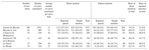 Table 3Proportions of reported speech and simple mentions across the six selected newspapers. This table presents data from 343 press articles, published between 10 May 2018 and 10 May 2021, on the seismo-volcanic activity off the coast of Mayotte. An indirect mention refers to when an actor is introduced in the press discourse by a third party, as opposed to a direct mention. A distinction is drawn between actors whose speech or opinion is reported (anything presented as their word or opinion, even if distorted) and actors that are simply mentioned.