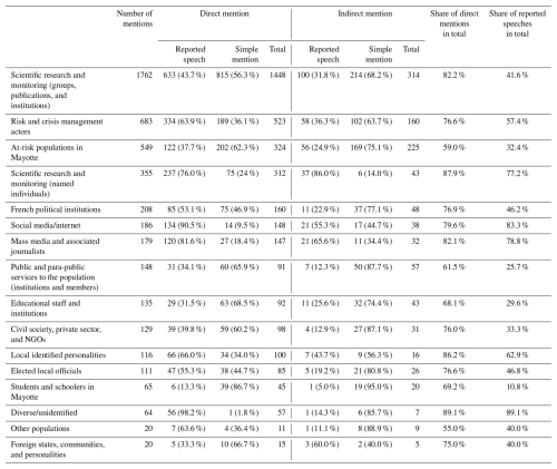 Table 4 reports the number and share of direct and indirect mentions and reported speech and simple mentions by actor category in the entire selection of articles. While most actor categories are primarily mentioned directly (i.e. without an intermediary), for certain groups, indirect mentions are more common. This is particularly true for at-risk populations in Mayotte, which, in more than 40 % of cases, are mentioned indirectly. The share of direct mentions is also relatively low for public and para-public services and for students and schoolers in Mayotte (over 30 % indirect mentions). Conversely, specifically named scientific and monitoring actors and identified local personalities are the groups most frequently mentioned directly.