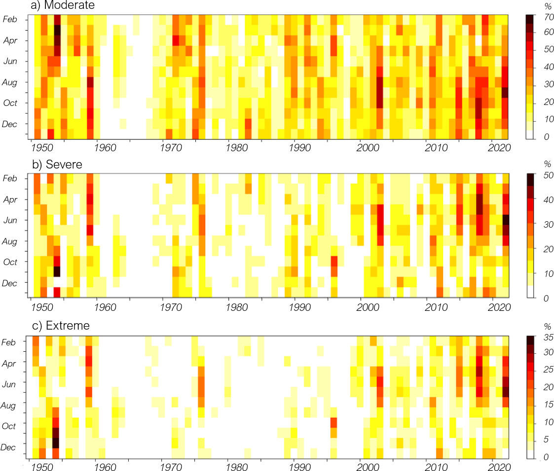 Figure 4Temporal evolution of the percentage of area affected by drought at European level for three drought severity categories: moderate (a; SPEI-6 between −1 and ), severe (b; SPEI6 between and −2), and extreme (c; SPEI6 below −2). The colour of the cell indicates the percentage of the European area covered by a drought (i.e. below SPEI6) of the corresponding intensity.