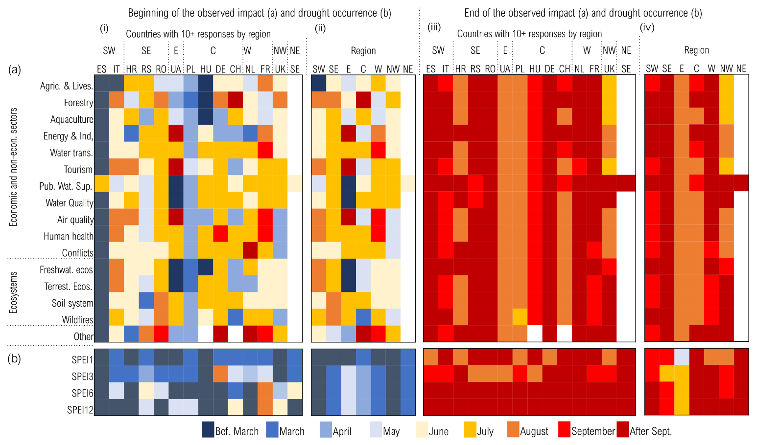 Figure 5Most commonly reported beginning (left) and end month (right) of drought impacts in Europe listed from south to north (a). The lower plot (b) indicates the onset of the drought defined as the first month when more than 50 % of the territory was under drought conditions (SPEI ) for SPEI-1, SPEI-3, SPEI-6, and SPEI-12 of each month. Only countries with 10 or more responses are shown. The European regions are described using the acronyms: SE (southeast), SW (southwest), E (east), C (central), W (west), N (Northwest), NE (northeast). Countries are indicated using their two-letter country code. White cells indicate missing data.