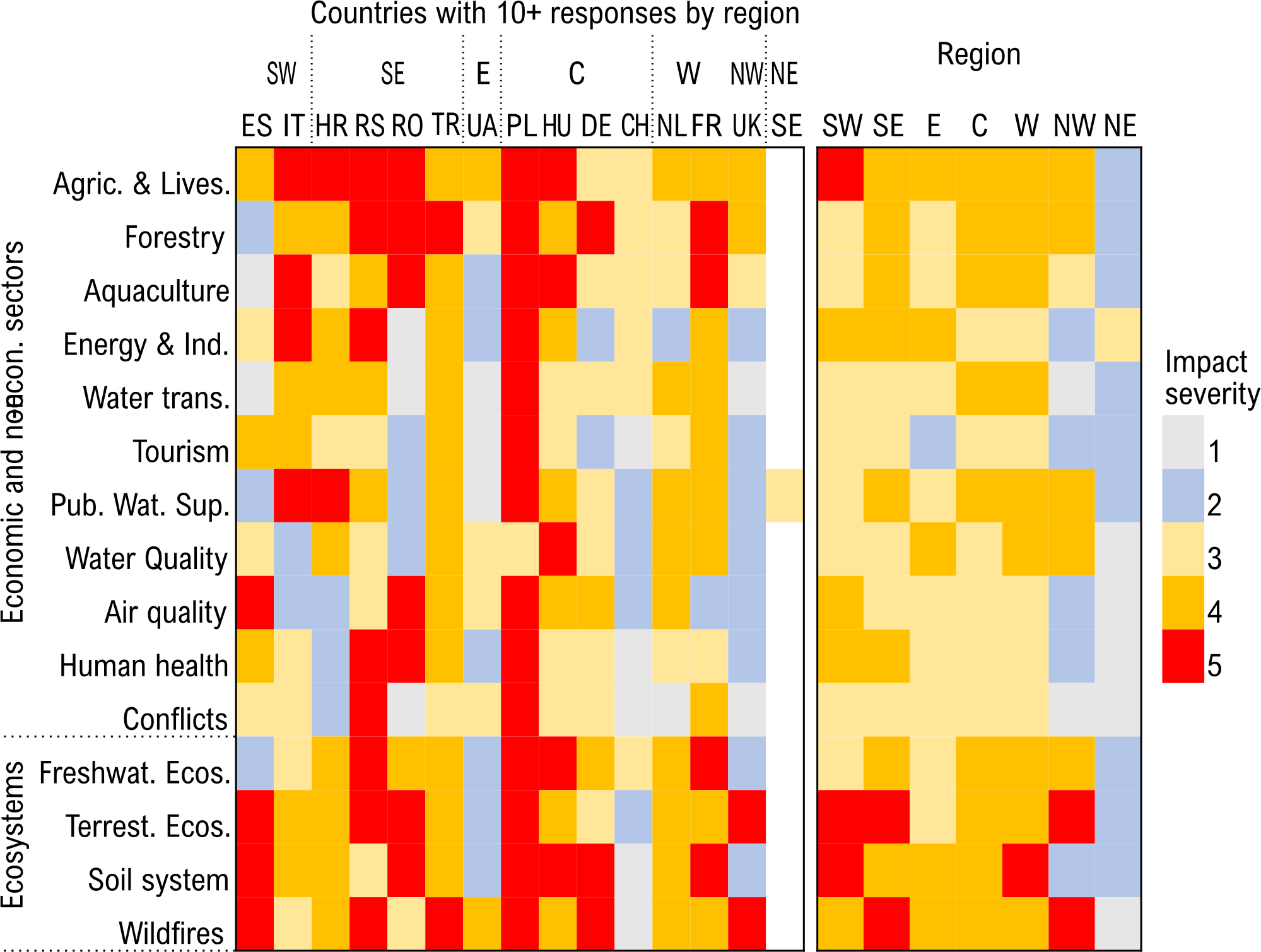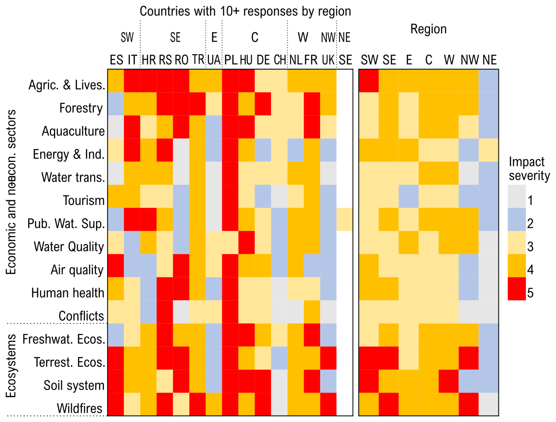 Southern Europe experienced earlier and longer-duration droughts with more severe consequences as compared to fewer and less severe impacts in the North. In particular, sectors such as Agriculture, Forestry, and Public Water Supply were highly impacted in Central and Southern Europe, with increased wildfires and soil degradation as examples. Conversely, Northern Europe witnessed less severe impacts (Fig. 6), as expected, due to the less severe drought conditions or even no drought at all.