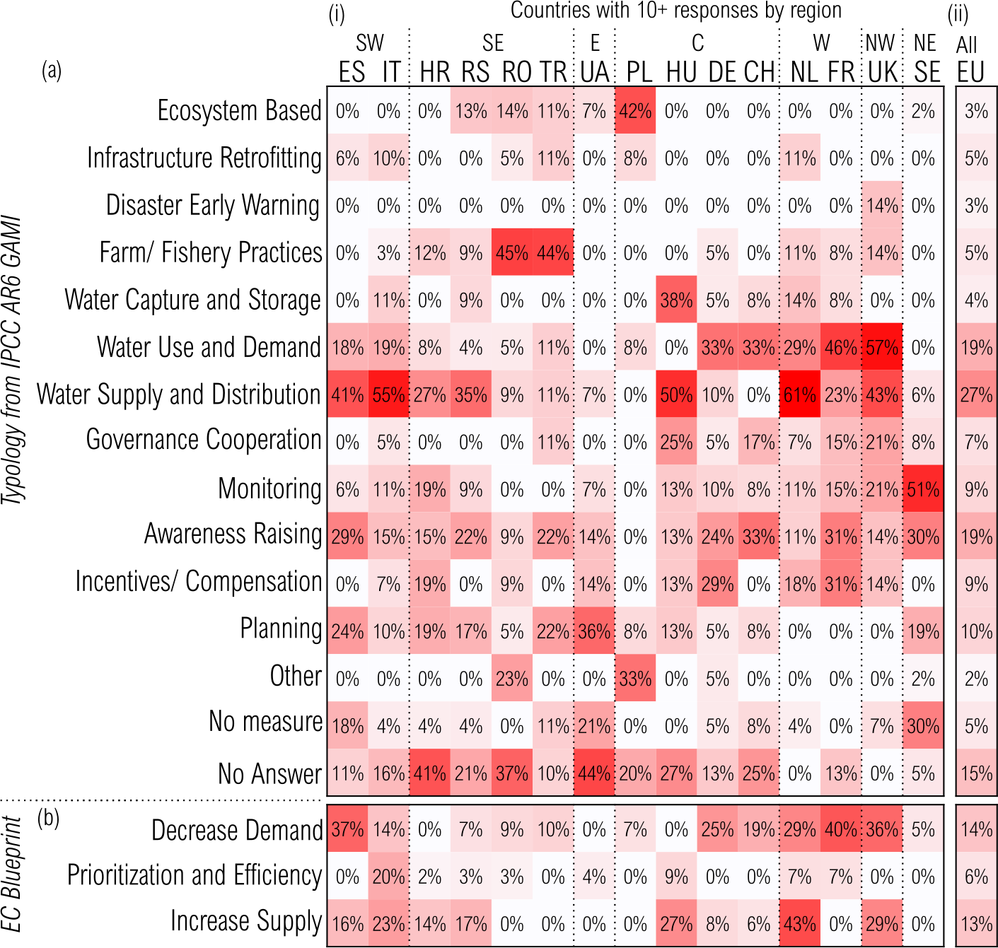 Respondents detailed their organizations' drought risk management measures in an open-ended question (question 12, Table 2). The responses to this question were reclassified using a typology devised by Reckien et al. (2023), which in turn is based on the IPCC AR6 GAMI (Chap. 16) (IPCC, 2022b). Responses were first translated from their original language to English using ChatGPT (chatgpt.com) to facilitate reclassification. Native speakers then validated these translations. Additional classification of the measures taken was applied following recommendations outlined in the EC Blueprint to Safeguard Europe's Water Resources of 2012. The Blueprint prioritizes different types of drought risk management measures, placing demand decrease as the highest priority, followed by prioritization and efficiency measures, and assigning the lowest priority to supply increase measures and infrastructural measures. Based on this, three categories were established to evaluate responses in this study: “Decrease Demand”; “Prioritization and Efficiency”; “Increase Supply”. Demand-side measures refer to those reducing water demand to match the decreased supply. Conversely, supply-side measures attempt to integrate water supply through additional or alternative water sources (e.g. groundwater) to meet demand. Two researchers were involved in the classification process to ensure the validity of the classification, with an inter-annotator agreement of 86 % (Table S3 in the Supplement).