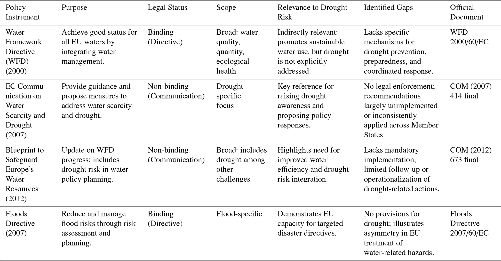 The scale of Europe's droughts and its interconnected socio-hydrological systems necessitate continent-wide drought risk management. Yet, Europe (where the EU represents the largest governance body) lacks a unified drought policy, relying instead on water-related directives and non-binding communications (Hervás-Gámez and Delgado-Ramos, 2019; Publications Office of the European Union, 2023; Stein et al., 2016). The 2000 European Commission's (EC) Water Framework Directive (WFD) is considered one of the most ambitious and substantial pieces of legislation dealing with water resource management (Voulvoulis et al., 2017), instituting catchment-level water management, environmental output requirements, unified monitoring, and international collaboration for transboundary catchments (Publications Office of the European Union, 2023; Stein et al., 2016). The WFD promotes a precautionary approach, emphasizing water conservation and stating that water is “a heritage to be protected” (DIRECTIVE 2000/60/EC Preface, Comma 1). Further developments on drought risk management include the 2007 EC Communication on Water Scarcity and Droughts and the 2012 EC Blueprint to Safeguard Europe's Water Resources, which provide guidelines for Drought Management Plans (DMPs) and country-level drought risk management (Hervás-Gámez and Delgado-Ramos, 2019). The latter emphases water conservation, stating the need to prioritize demand-reduction over efficiency measures, especially over increased supply and/or infrastructural measures (Hervás-Gámez and Delgado-Ramos, 2019; Stein et al., 2016). Despite its guidelines and ambitions, the EU's drought risk governance framework has significant gaps: the WFD does not directly address drought risk management; EC Communications of 2007 and 2012 are non-binding, lacking mandatory action for member states; and the fragmentation of institutional provisions of regulations impede coordinated effort and clear guidance (Publications Office of the European Union, 2023; Stein et al., 2016). This is in contrast with the EC Flood Directive, which laid the basis for European-level flood governance, creating a precedent for integrated Europe-wide legislation on a hazard-specific risk management policy. Table 1 summarizes the content and relevance of the policy instruments described in this section.