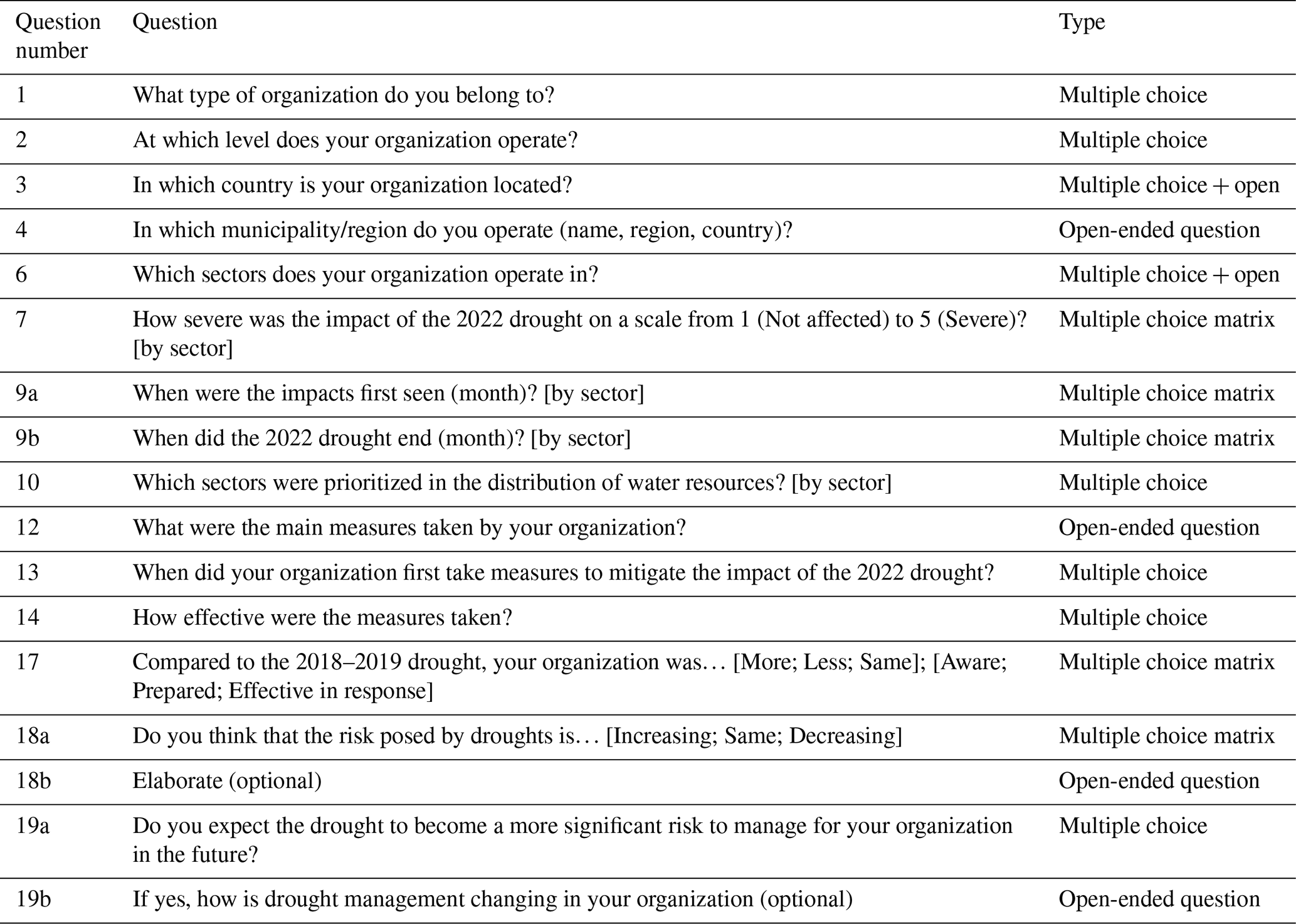 To collect data on drought impact and management measures, a questionnaire targeting water managers responding to the 2022 European drought was designed by drought experts of the DitA working group of the IAHS-HELPING initiative (https://iahs.info/Initiatives/Scientific-Decades/HELPING/, last access: 28 October 2025). Topics covered in the questionnaire include sectoral impacts of the drought, the occurrence of compounding and concurrent hazards, the measures taken by the respondents' organizations (along with their effectiveness and timeliness), the presence and use of preparedness measures, and developments in drought risk management across Europe. The questionnaire comprises 19 questions (24 including additional clarification options), of which 14 (17 including clarifications) are analysed in this study. The selected questions (listed in Table 2) focus specifically on drought impacts and risk management, as well as general questions regarding the respondents' organizations background and function.