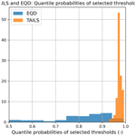 Since the relative magnitudes of the data at different locations vary, we present the selected threshold probabilities rather than the threshold magnitudes; these are illustrated in Fig. 4. The TAILS approach clearly selects higher thresholds compared to the EQD approach, as expected. The lowest threshold selected by the TAILS and EQD methods is 0.903 and 0.501, respectively, and the highest threshold selected by the TAILS and EQD methods is 0.993 and 0.991, respectively. The lowest threshold selected by the EQD approach is very close to the lower limit, which was the median (i.e., 0.5).