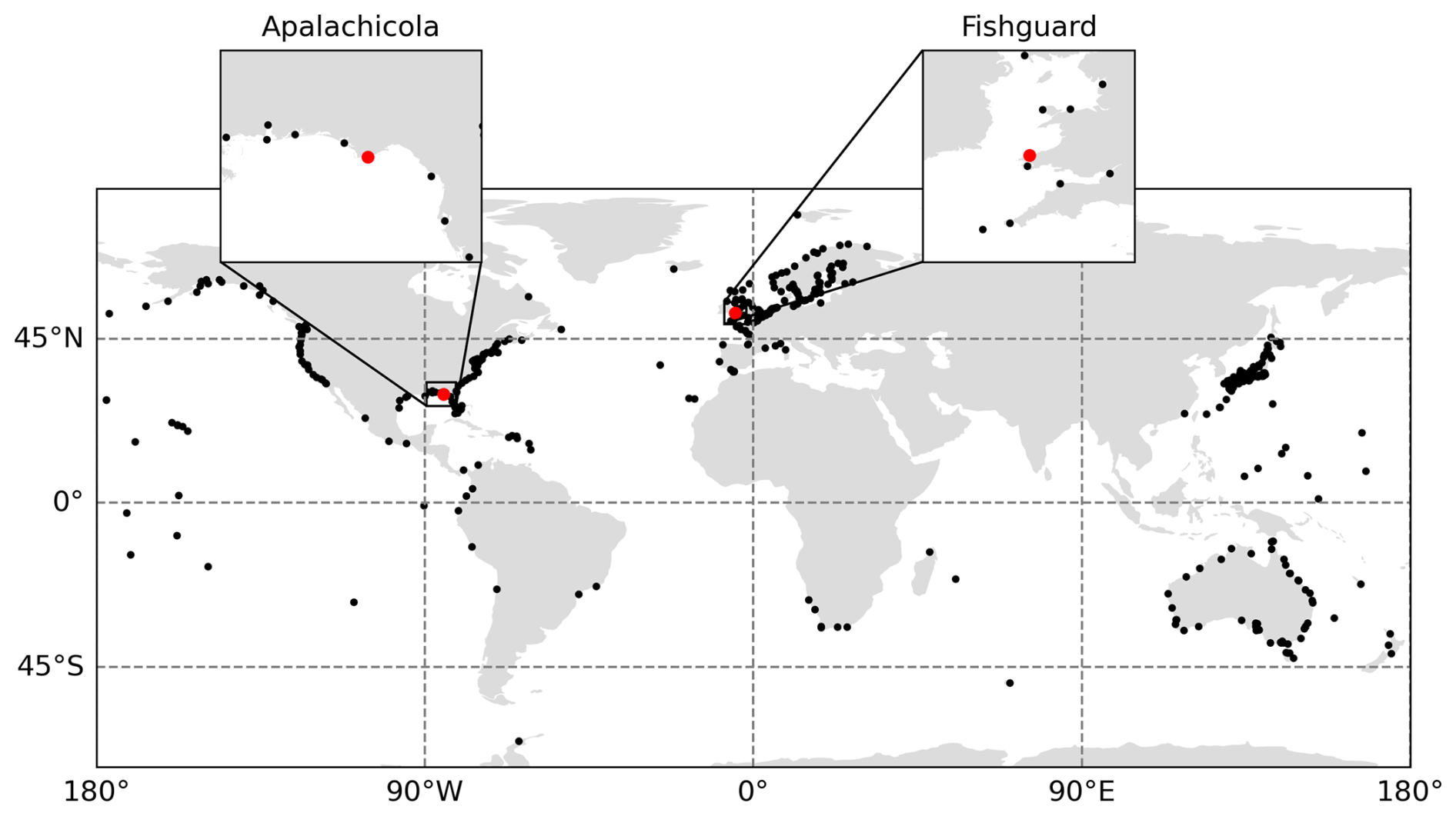Figure 1Map of GESLA record locations with record lengths greater than 40 years. The two locations highlighted in red are Apalachicola, US and Fishguard, UK, which are discussed in more detail in Sect. 5.4.