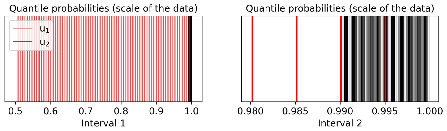 with an analogous formula following for u2, i.e., . The resulting probability sets and , with m=100, are illustrated in Fig. 2. This demonstrates clearly that the lower the threshold level u, the lower the quantile probabilities evaluated by the EQD metric. Thus, quantiles lying far into the tail of the data will carry significantly less weight for lower thresholds than for higher thresholds.