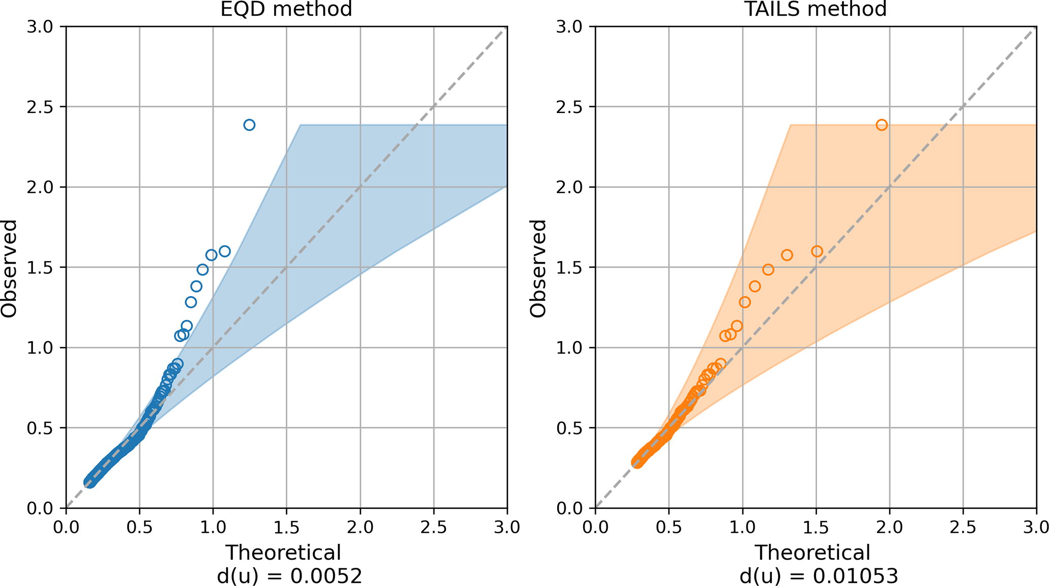Figure 3QQ plots for the thresholds selected using the EQD (left) and TAILS (right) approaches; see Sect. 4 for more details of the TAILS method. The sub captions in both cases gives the EQD score d(u) at the threshold chosen by both methods.