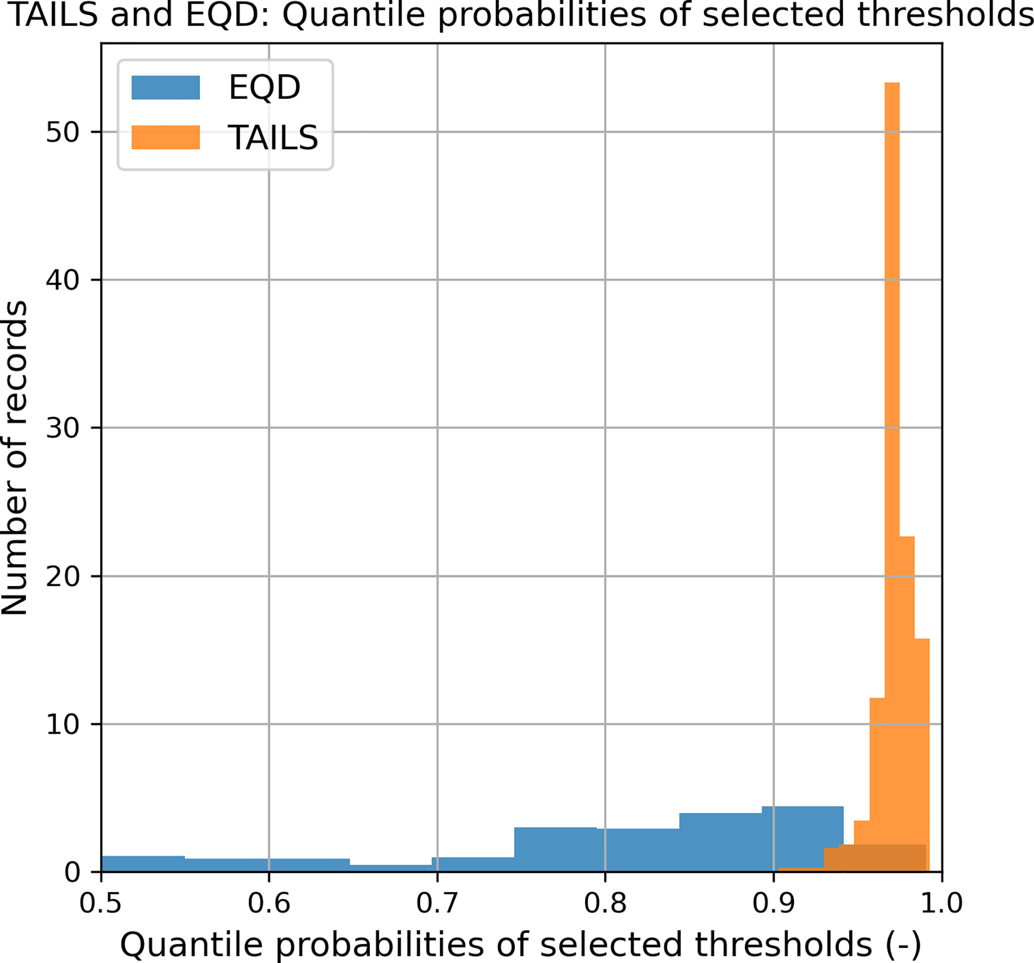 These findings indicate that whilst the EQD approach outperforms many existing techniques, it can, in some cases, result in model fits that fail to capture the most extreme observations. This drawback motivates novel developments, and in this work we propose an adaptation of the EQD technique, which we term the TAil-Informed threshoLd Selection (TAILS) method. Unlike the EQD approach, our technique focuses exclusively on quantiles within a pre-defined upper tail of the data, independent of the choice of threshold. Furthermore, we demonstrate in Sect. 5 that TAILS results in improved model fits across a wide range of tide gauge records. Code for implementing the TAILS approach is freely available online at https://github.com/callumbarltrop/TAILS (last access: 11 November 2025).