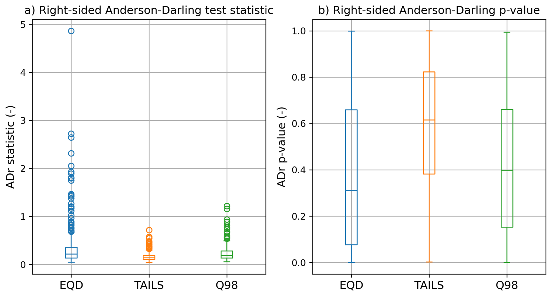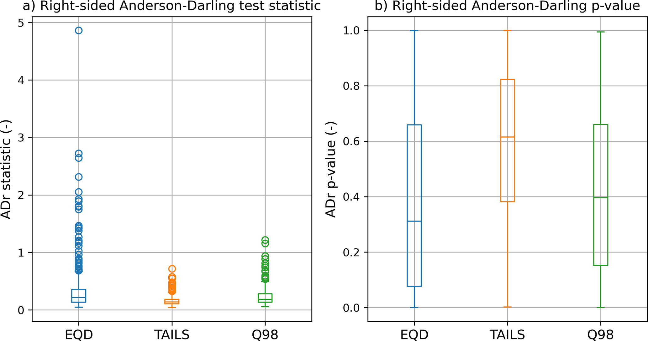 The ADr test statistic (Sinclair et al., 1990; Wasserstein and Lazar, 2016; Solari et al., 2017) is used to measure the goodness-of-fit of the exceedances over the thresholds selected using both the EQD and TAILS methods, as well as the model fits computed using the Q98 approach. The test compares the theoretical quantiles against the empirical distribution, with more weight placed on the tails of the distribution (hence right-sided). The statistic quantifies the deviation of the data from the specified distribution. A p-value is obtained by bootstrapping the test statistic, with p indicating the probability of observing such a deviation under the null hypothesis that the threshold exceeding data follows a GPD. The null hypothesis is typically rejected for p-values below 0.05, corresponding to a 5 % significance level.
