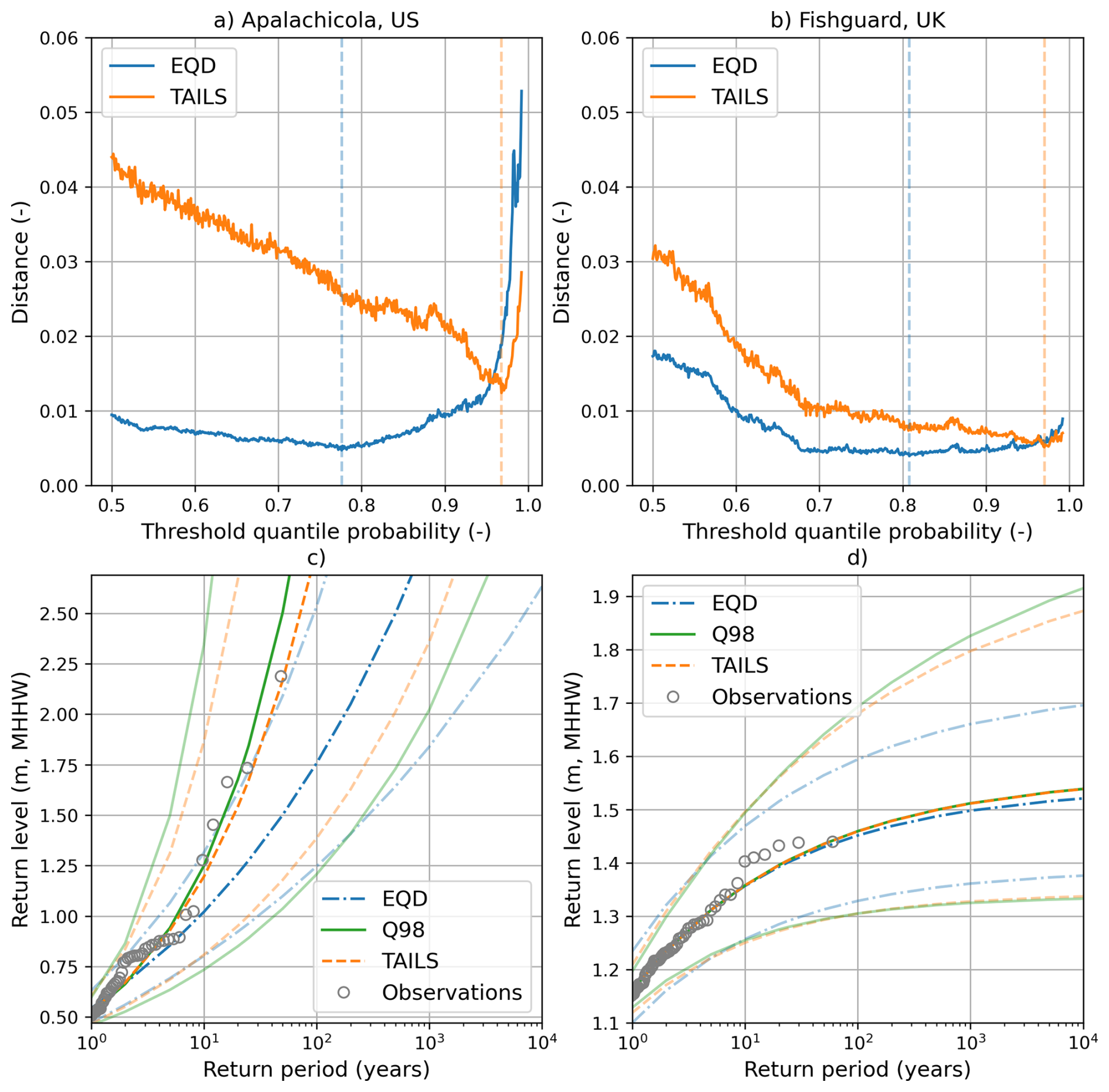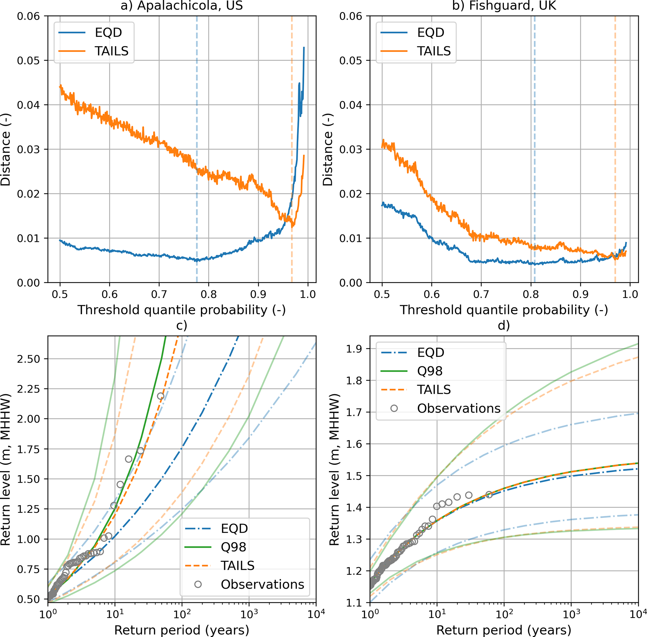 Figure 7Model fits for two locations. Left column: Apalachicola, US (a, c). Right column: Fishguard, UK (b, d). The top row (a, b) shows the TAILS and EQD distance metrics, plotted as a function of the threshold probability. The vertical dashed lines indicate the distance minima, and therefore the selected threshold quantile probability. The bottom row (c, d) displays the return level plots for both methods, alongside the empirical plot and model fit obtained by using the Q98 approach. The shaded areas indicate the 95 % confidence interval, calculated using bootstrapping of the GPD parameters.