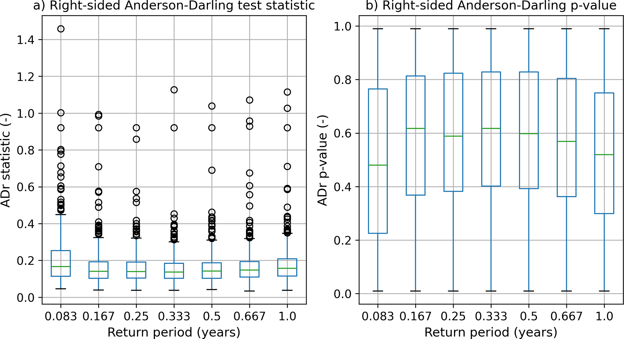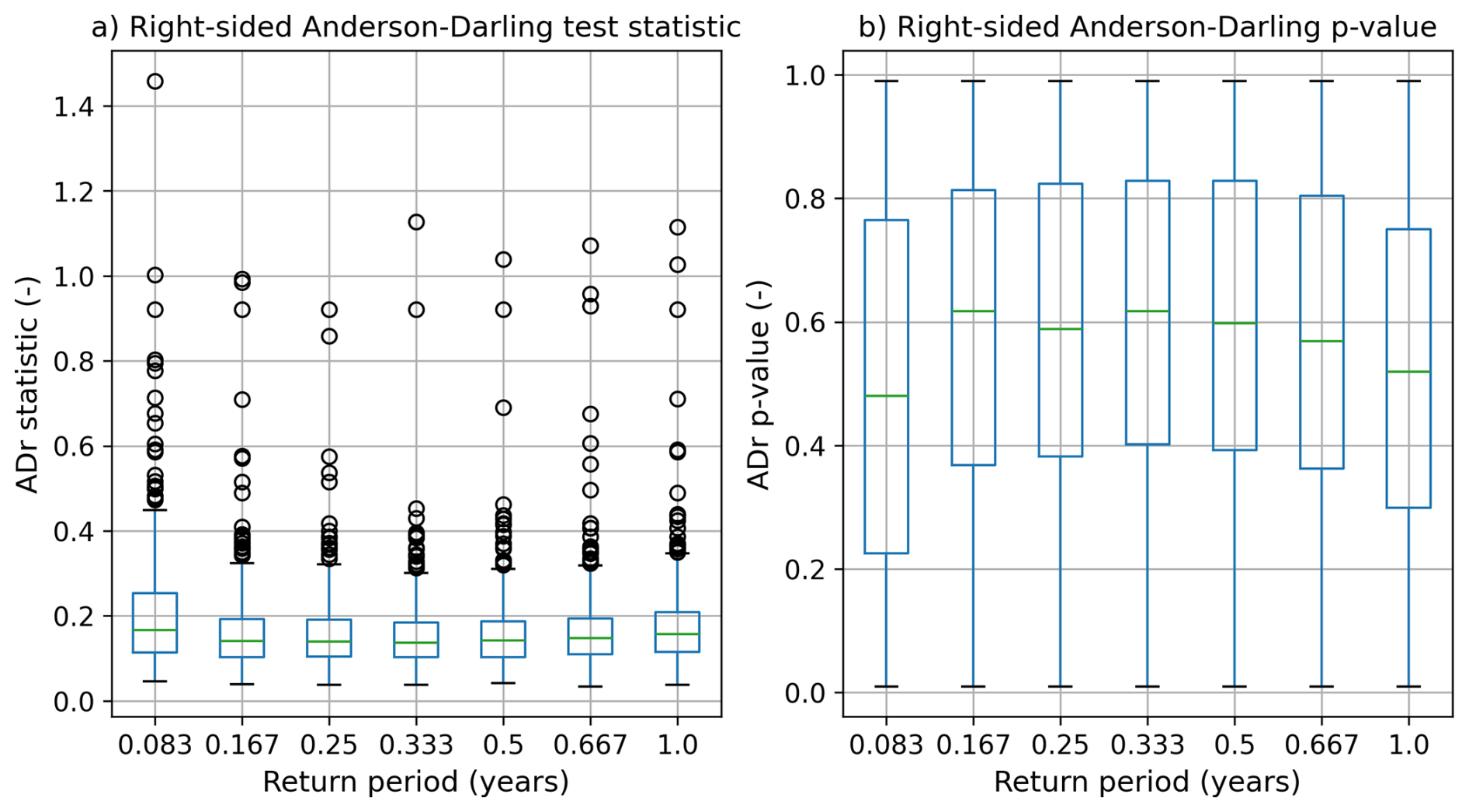 The results of this sensitivity test are shown in Fig. A1. Figure A1a presents the ADr test statistic for the 7 return periods tested. When looking at the median and interquartile ranges of the ADr test statistics, the threshold selection looks relatively insensitive to the return period chosen, with very little differences between the 0.167, 0.25, 0.333, and 0.5 year return periods. When considering the ADr test p-value in Fig. A1b, there is also only small differences between the 0.167, 0.25, 0.33 and 0.5 year return periods. We take this, along with the value obtained from the literature (presented in main article), as evidence that any one of these values would suffice as the baseline probability, p1.