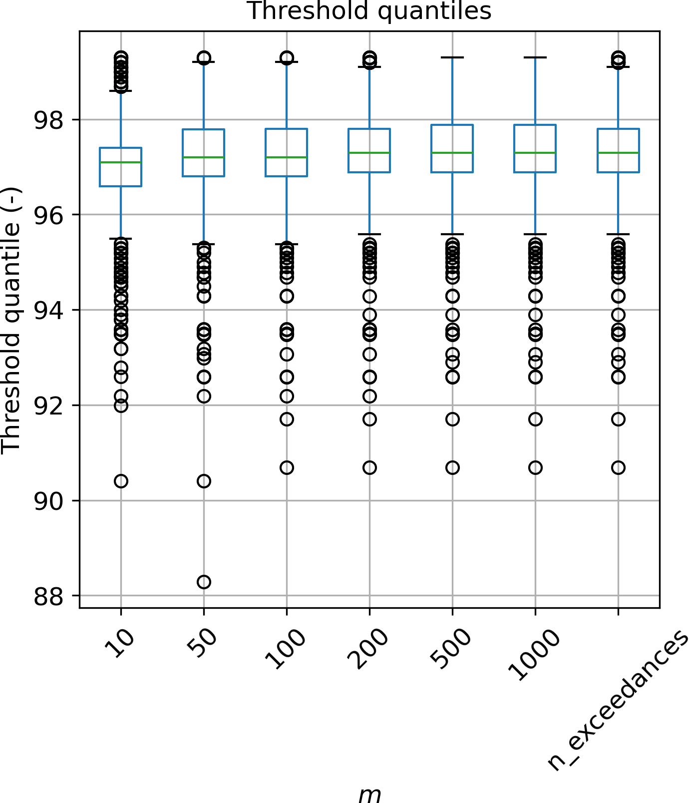 TAILS requires a selection of several non-trivial tuning parameters; this includes the probability set 𝒫, m, and the limit on candidate thresholds, which we define as the 1 year return level in Sect. 4. Our choices were motivated by the specific application at hand, and we consequently recommend that practitioners experiment with these parameters to assess whether such values have a practical effect on the resulting model, using diagnostics such as QQ and return level plots to guide this procedure. The code has been written in such a way as to make it easily parallelised, allowing for fast testing of multiple baseline and maximal probabilities across a variety of datasets. We encourage and invite fellow researchers to utilise this method on other perils, such as rainfall or river flow measurements. Exploring data-driven techniques (e.g., cross validation) for selecting tuning parameters of automated threshold selection approaches remains an open area for novel developments.
