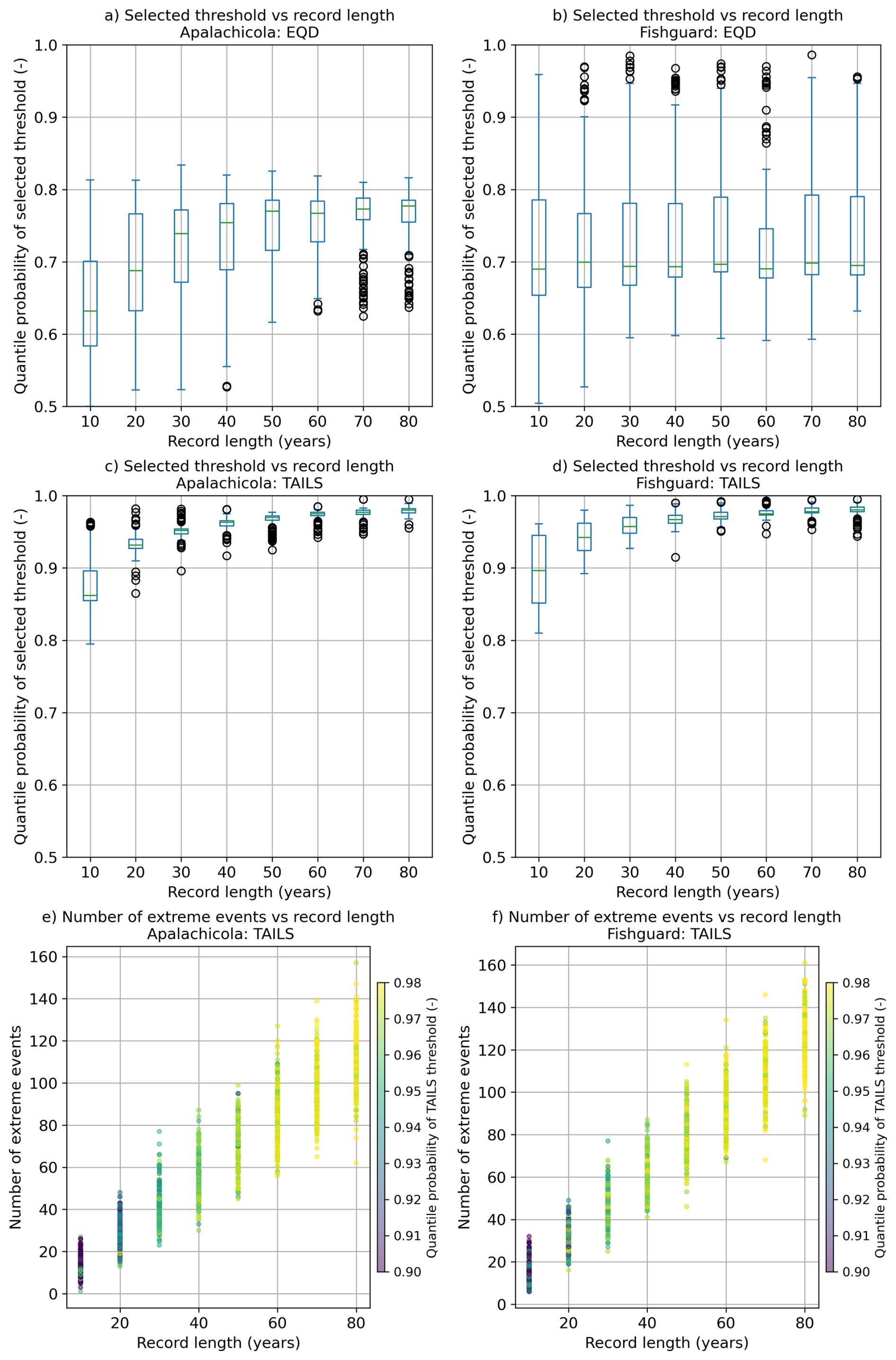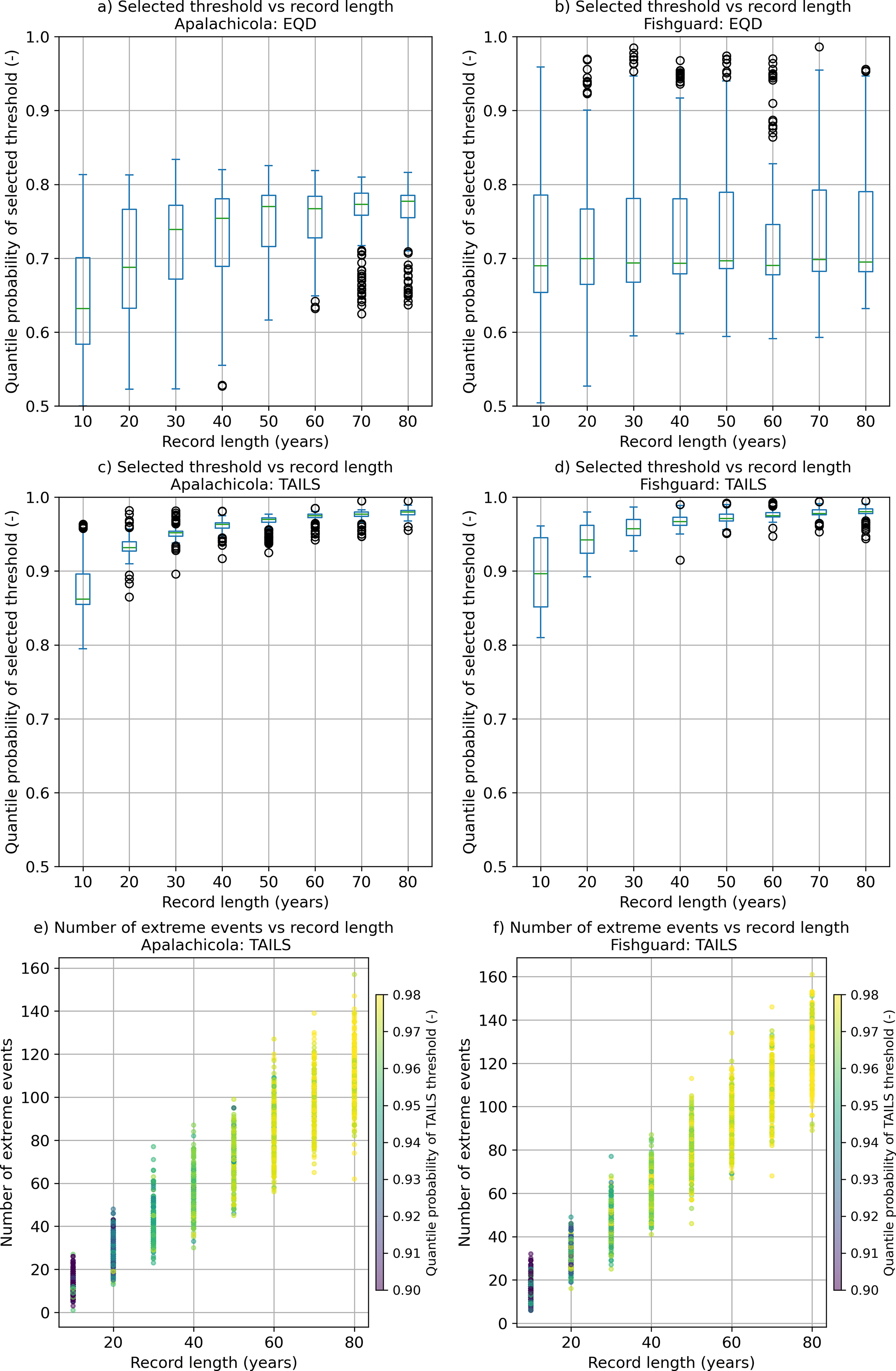 A test was carried out to determine the sensitivity of the TAILS method to the length of the record and the number of extremes present in the record. Whole years from the tide gauge records investigated in Sect. 5.4 (Apalachicola and Fishguard) are randomly sampled using 200 bootstraps with replacement to create synthetic records of length 10, 20, 30, 40, 50, 60, 70 and 80 years. The records are then declustered using a 4 d storm window, and the TAILS threshold is obtained. Comparisons are made against the EQD method for reference. The number of extreme events in each bootstrapped sample is obtained. An extreme event is defined as a water level in the bootstrapped sampled record that is greater than the 0.99 quantile of the original declustered record. The distributions of the quantile probabilities of the TAILS and EQD selected threshold are plotted as box plots below, in Fig. A5a, b, c and d. Figure A5e and f show the number of extreme events plotted against record length, with the colour map of the markers illustrating the quantile probability of the TAILS threshold.