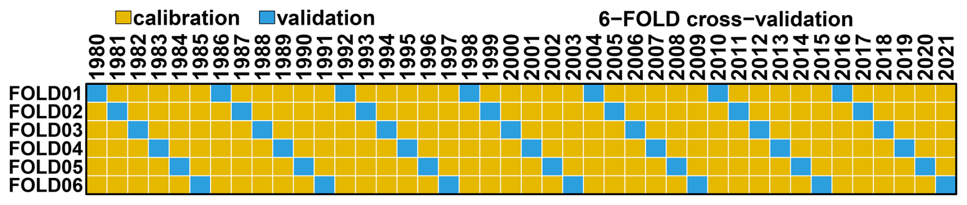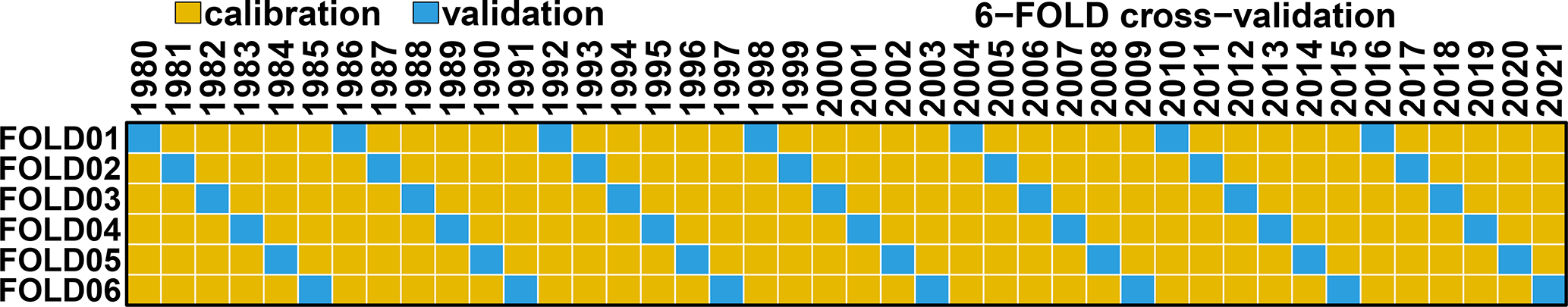 Figure 2Scheme of the “Validation experiment”: 6-fold cross-validation scheme over the 1980–2021. Yellow years are used for the calibration and blue for validation. One out of six years is used for validation, making seven out of 42 per fold.