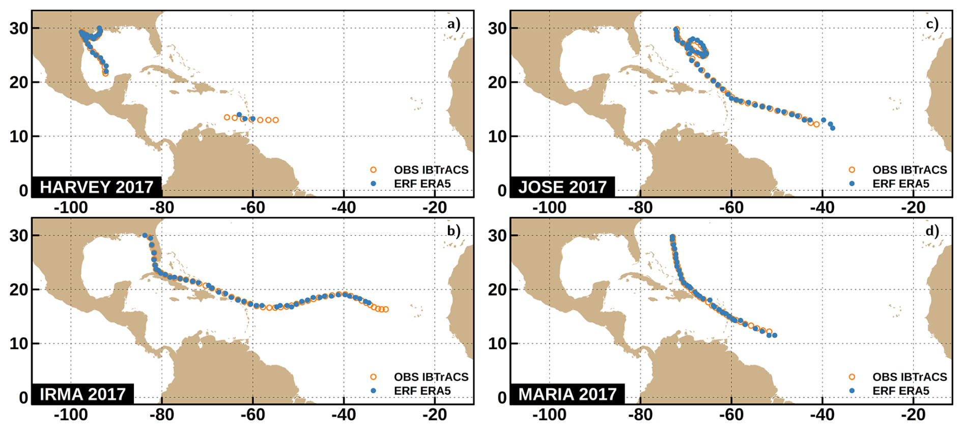 Figure 4ERF-based TC tracks reconstructed over validation year 2017 for the NATL for the “25-times” setup. (a) Harvey, (b) Irma, (c) Jose and (d) Maria.