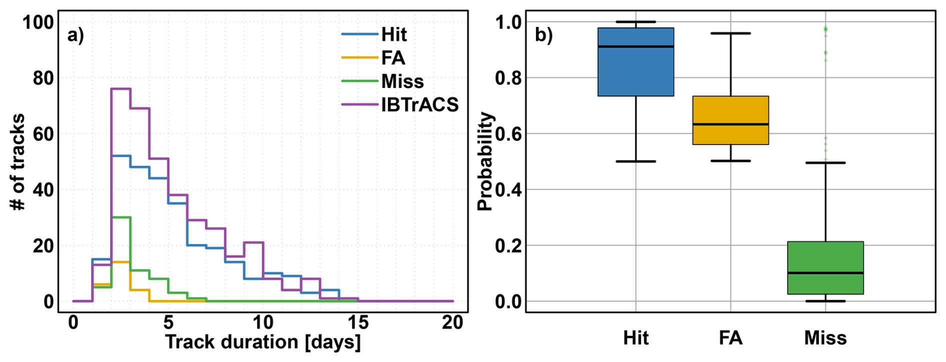 In the following, the statistical and physical properties of the detected tracks are investigated. Figure 5a shows the track duration histograms for the observed, ERF-detected tracks (Hit and FA) and missed tracks. ERF-based Hits have a duration distribution quite similar to IBTrACS tracks, but with substantial differences for short-duration tracks (1 to 3 d). These short-duration tracks have a typically short lifespan and are of lower intensity. This discrepancy is supported by the duration distribution of Miss tracks, which is mainly short-duration tracks (the majority of them last between 2 and 4 d). False alarms are also of the same duration. Differences in probabilities of TCs given by ERF associated with every time step of Hit, FA, and Miss of tracks are then investigated. Figure 5b shows TC probabilities conditionally on its labelling as Hit, Miss, or FA. Probabilities associated with Hit tracks (median above 0.9) are substantially different compared to those associated with FA (median a little above 0.6). This means that even if FA tracks are detected (probability >0.5) by ERF, FA are less likely to happen than Hits. Miss tracks are associated with very low probabilities, meaning they are completely missed by ERF while having been recorded in IBTrACS.