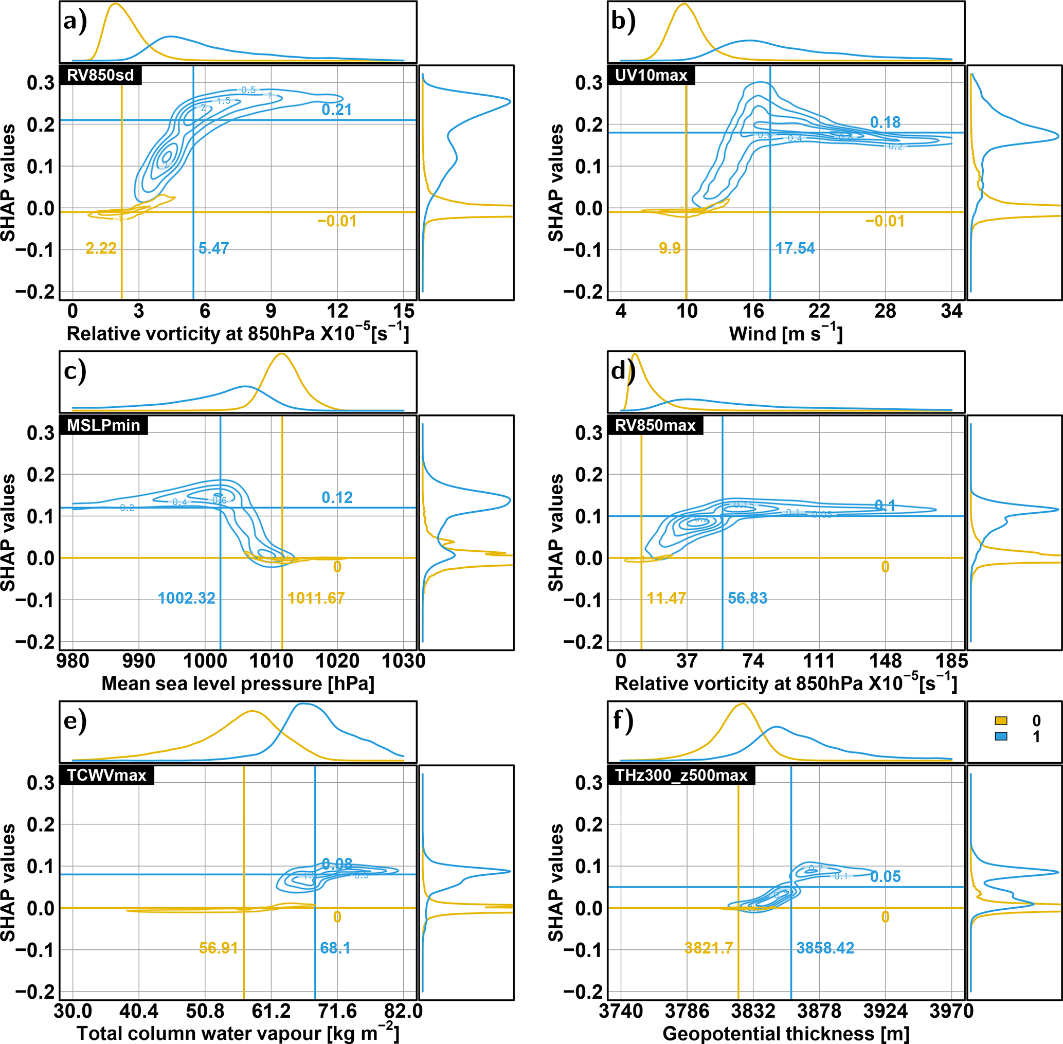 Feature importance quantifies the average contribution of a given predictor in discriminating TC from non-TC situations. However, it would be interesting to determine the contribution of each predictor to each outcome of an RF. Indeed, we want to evaluate the ability of RFs to learn the relevance of each predictor to drive each TC/non-TC prediction. This is provided by the SHAP-based partial dependency plots shown in Fig. 10 for the NATL basin. This figure pictures the relationship between the six top predictors (according to feature importance) and their respective SHAP values. Note that given the computing time, SHAP values are computed for only one RF among the 100 RFs of the calibration experiment and the “25-times” setup. These partial dependence plots are probably very similar for the 100 RFs, given the small dispersion of the MCC, POD and FAR performances' metrics (see Fig. 3) and feature importance (see Fig. 9). Let us consider the partial dependency plot in panel a of Fig. 10. On the abscissa is given the physical range of RV850sd and the associated SHAP values on the ordinate. It shows the contribution of RV850sd given its value to the probability value of TC occurrence.