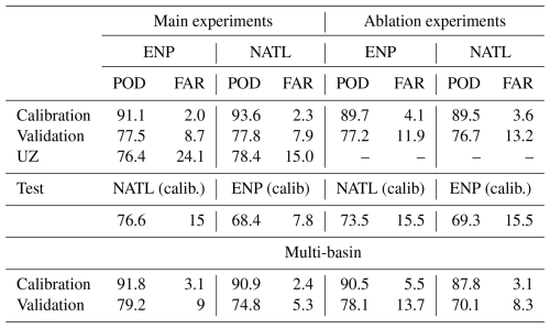 Table 1POD and FAR for tracks reconstructed from average probability from ERF for calibration, validation, and test experiments for the “25-times” setup and for UZ in %. Multi-basin refers to POD and FAR from ERF applied to both ENP and NATL basins under the “25-times” setup discussed in Sect. 4.1. The right part of the table, referred to as “Ablation experiments”, gives the POD and FAR for ERF experiments conducted with a reduced number of predictors discussed in Sect. 4.2