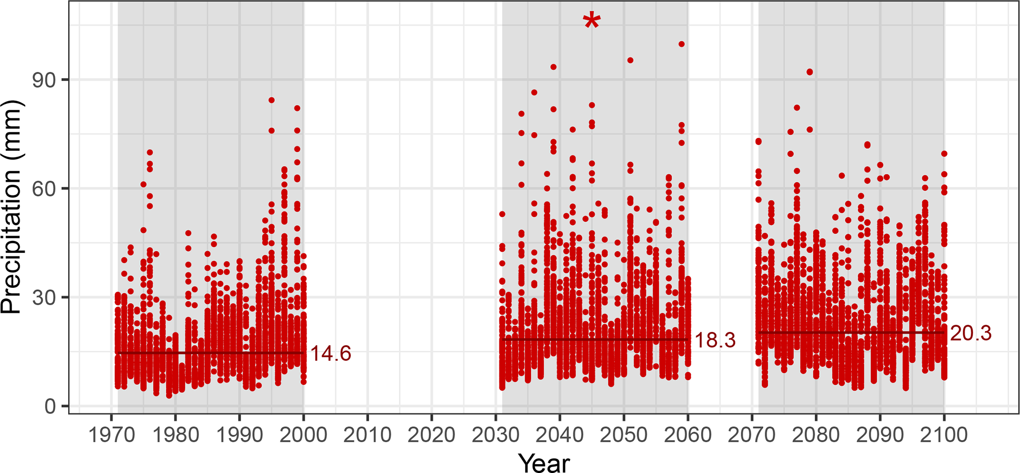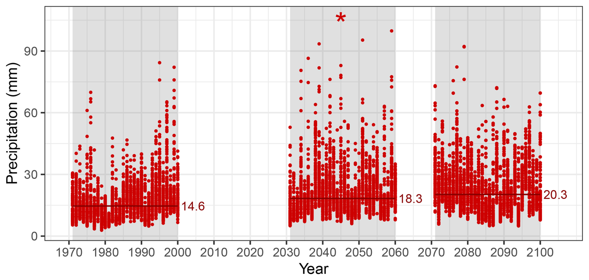 The choice of the RCP8.5 climate scenario for the rainfall analysis and the fact that only one global-regional model combination was available for the study. This limitation affects the estimation of the strength of the precipitation change, that is at the upper range of changes reported by Hundhausen et al. (2024) for the area average in southern Germany.