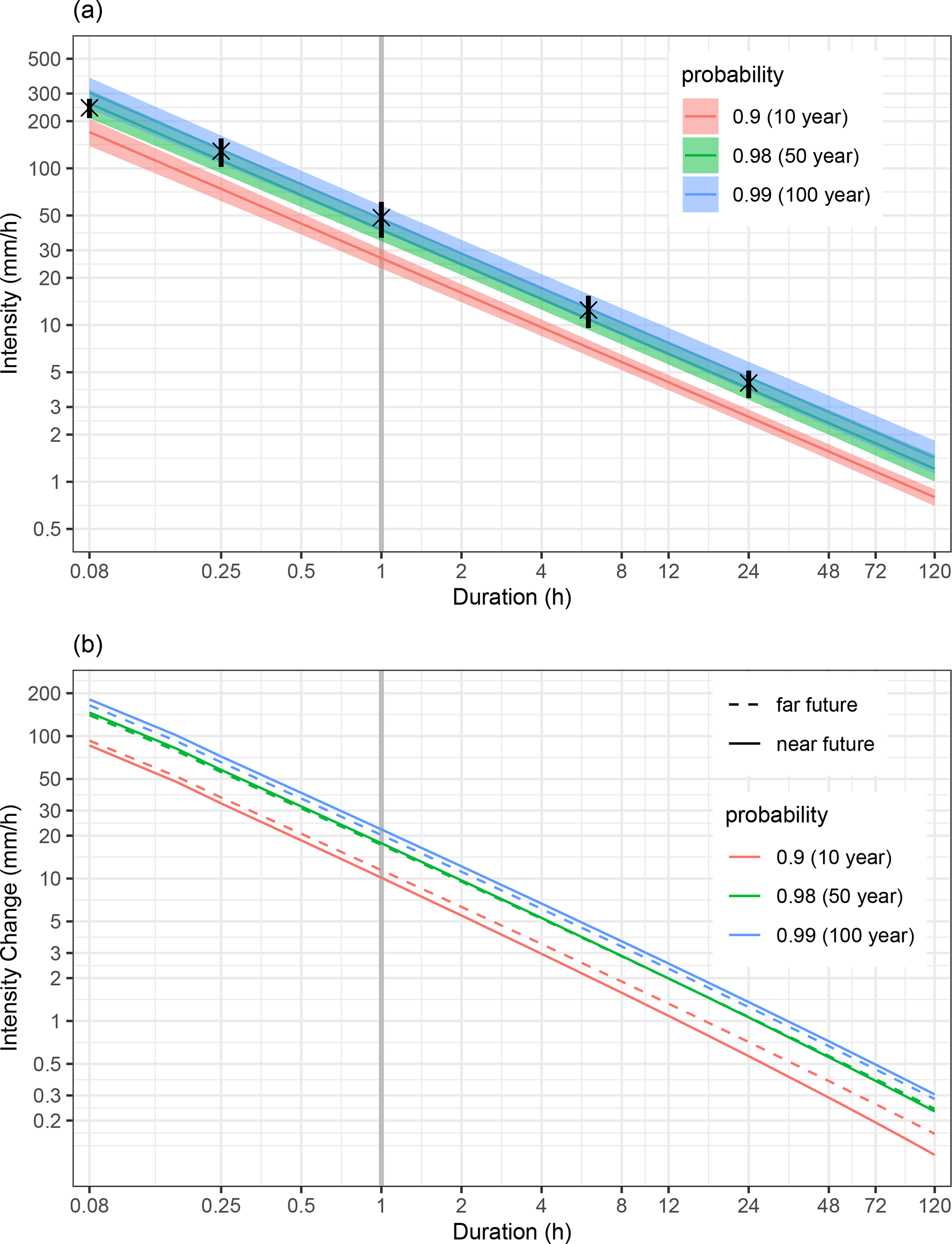 The relationship between intensity and duration for different event probabilities in the historical period of the climate simulation can be seen in Fig. 3. Due to the temporal resolution of the input data, the d-GEV could only be fitted using accumulation periods ≥ 1 h (i.e. the region right of the vertical grey lines).