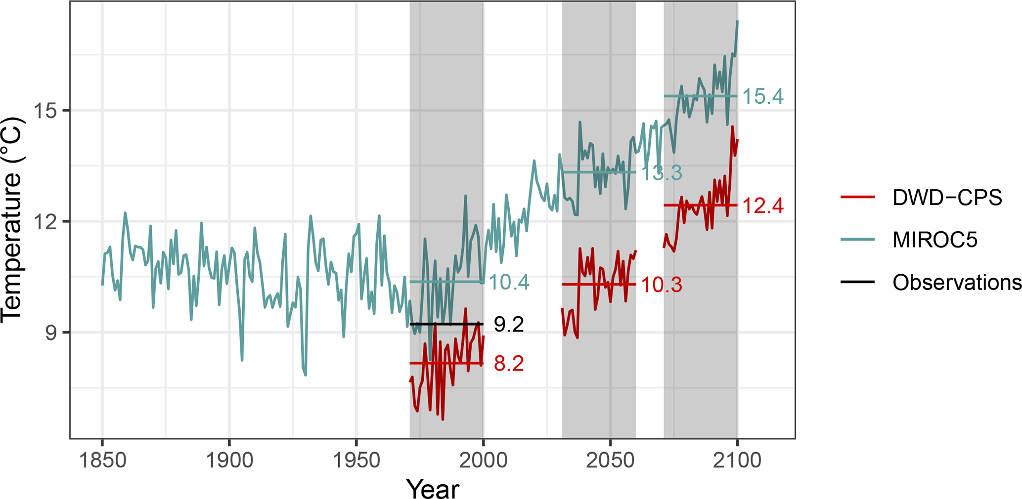 A comparison between the three periods simulated with CCLM-CPS shows a clear increase in temperature with increasing GHG forcing for the study area (Fig. 4). In comparison with the mean temperature at the Berlin Dahlem station, the driving global model MIROC5 exhibits a positive bias, while the convection permitting model CCLM-CPS is around one Kelvin too cold during the reference period. The temperature trend in the scenario period is stronger in the global model than in the convection permitting model. In both models, the temperature variability beyond the trend decreases with increasing GHG concentrations.