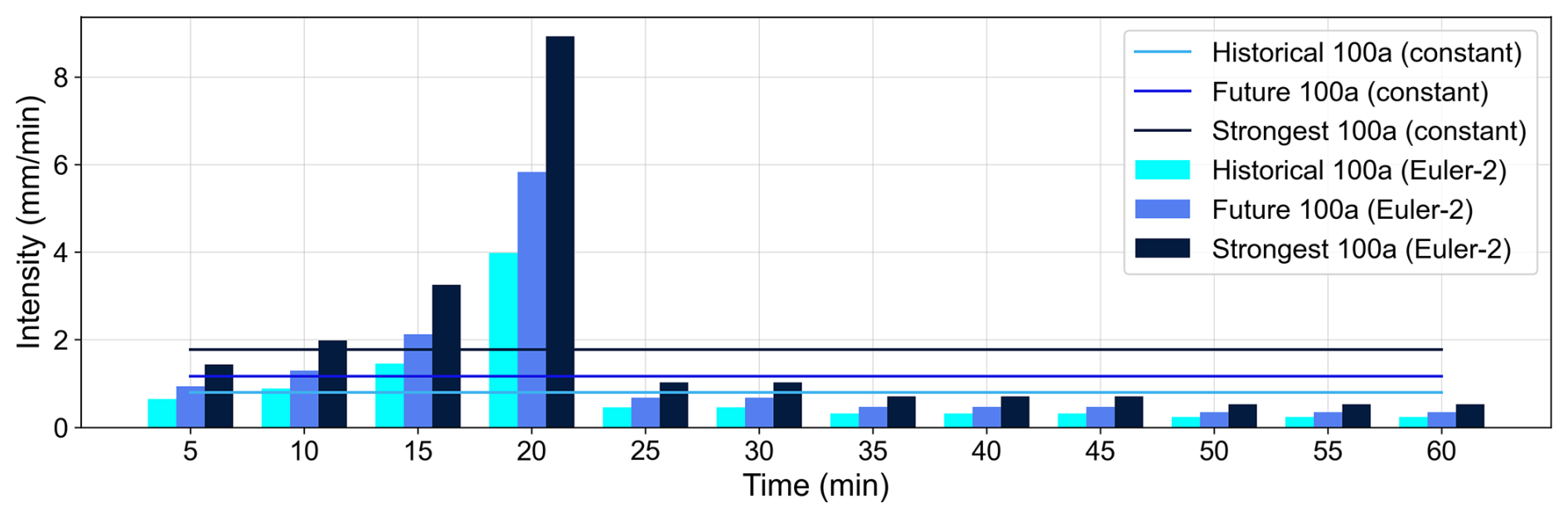 When comparing Euler-2 to constant rainfall, constant rainfall produces 51 % (Historical 100a), and 54 % (Future 100a and Strongest event) smaller flood volumes after 30 min than the corresponding Euler-2 event. By the end of the rainfall event, however, the reductions are much smaller with 7 % (Historical 100a), 13 % (Future 100a), and 15 % (Strongest event). These significant differences highlight the importance of temporal rainfall distribution particularly for peak values and even more for increasing rainfall sums, and the need of sub-hourly rainfall intensities.