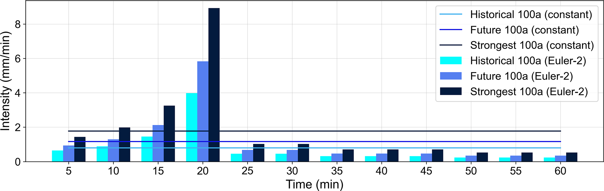 Figure 5Rainfall inputs for hydrodynamic flood simulations: hourly 100-year events for Berlin with temporal distribution after Euler-2 design rainfall and constant rain intensities; Euler-2 intensities are constant over each 5 min interval.