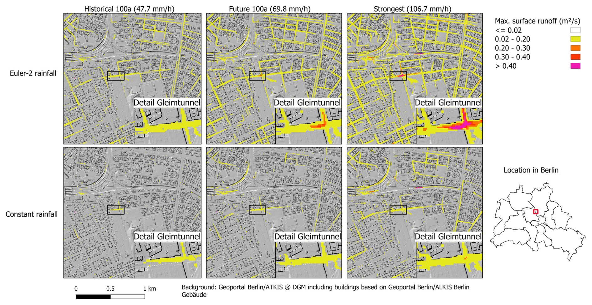The impacts of these increases in extreme precipitation on flooding characteristics in a Central-Berlin region around the Gleimtunnel, which is known for frequent pluvial flooding, are studied by conducting simulations with the 2D surface flow model hms coupled to a 1D drainage model. The Future 100a event results in a 51 % increase in the simulated maximum water depth, a 43 % increase in maximum surface runoff at the local flooding hotspot Gleimtunnel, and a 33 % increase in the volume of combined sewer overflow at one selected outfall. For the Strongest event, the respective increases are 137 % (maximum water depth), 296 % (maximum surface runoff), and 74 % (combined sewer overflow).