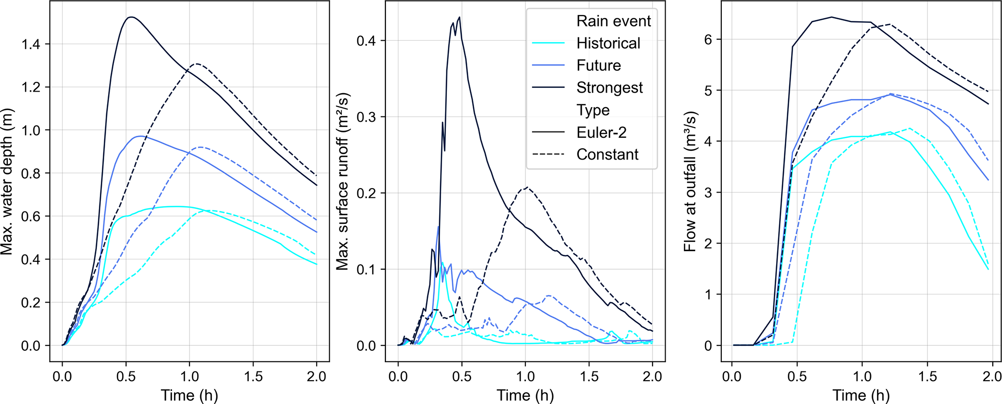 As a coupled model of the flow on the surface and in the subsurface drainage system is used, the effects of different rainfall amounts and temporal developments in the drainage system can be assessed as well. Figure 8 (right) illustrates exemplarily the results of the outflow at one model outfall, which reflects combined sewer overflow (CSO) into the nearby river. For the simulated period, the CSO average flow rate and overall volume increase from the Historical 100a to the Future 100a event by 33 % for Euler-2 rainfall and 27 % for constant rainfall, and from the Historical 100a to the Strongest event by 74 % for Euler-2 and 68 % for constant rainfall. As depicted in Fig. 8, the flow has not stopped yet at the end of the simulation time, so the differences in the final overall volumes might be a bit different than the numbers given above. In the case of constant rainfall, CSO starts later and has later peaks, but with almost the same magnitudes.