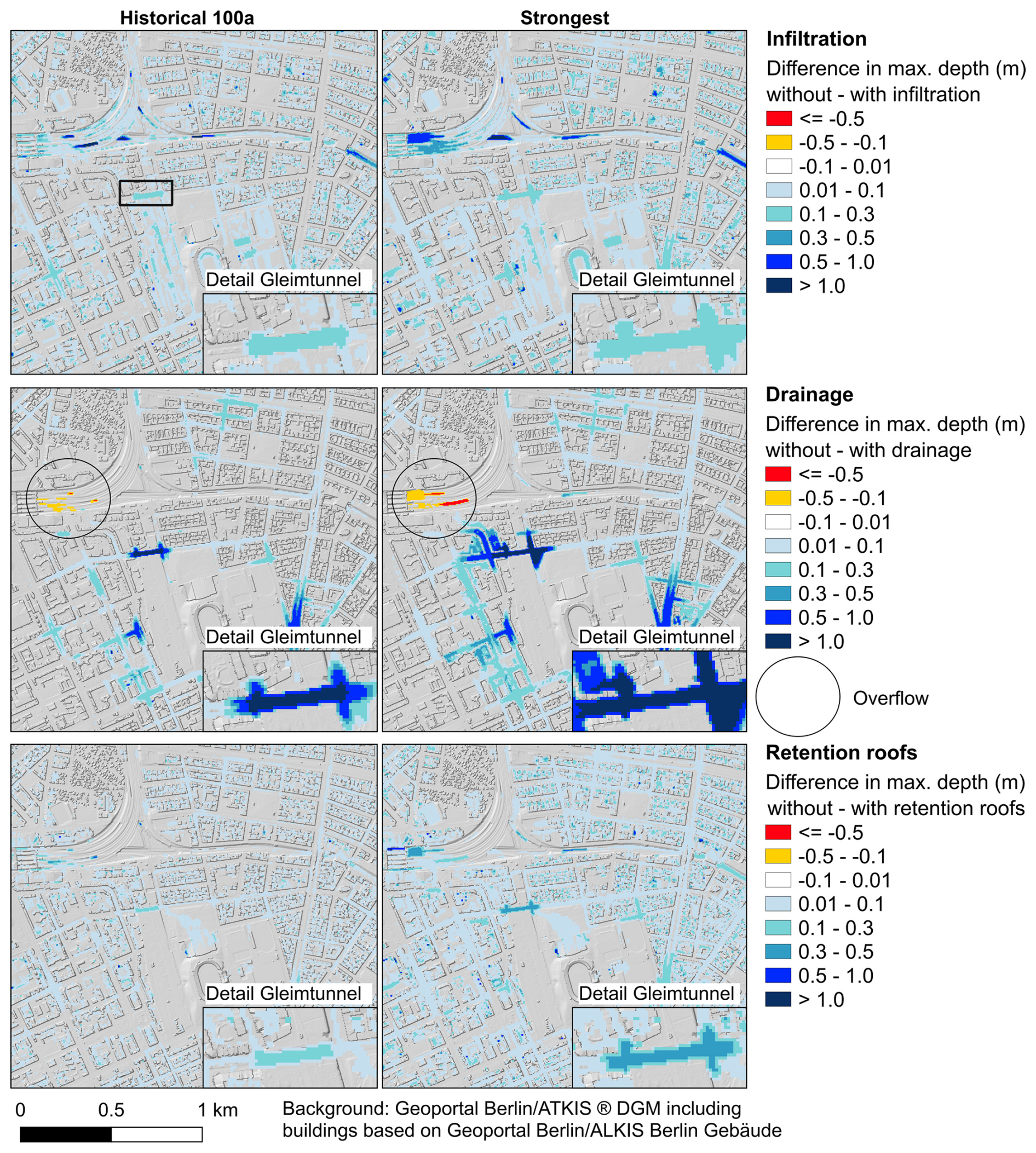 Comparing the effects of infiltration, drainage system, retention roofs, and the additional storage below the Mauerpark on the maximum water depth in the local flooding hotspot Gleimtunnel gives the following ranking for the Historical 100a event: (1) Drainage (170 %), (2) Infiltration (33 %), (3) Retention roofs (22 %), and (4) Mauerpark storage (16 %). The effects on the overall flood volume after 30 min are ranked differently: (1) Infiltration (83 %), (2) Retention roofs (39 %), (3) Drainage (23 %), and (4) Mauerpark storage (less than 1 %). At the end of the simulation time, the reduction due to drainage increases to 75 %. The drainage system is particularly efficient in reducing flooding at hotspots and to later timesteps than during the peak, the Mauerpark storage contributes to some extent to mitigating flooding specifically at Gleimtunnel, and the presented scenarios of infiltration and retention roofs across the entire catchment have distributed effects, while if realized in large spatial extent as in the given scenarios, they also contribute significantly to reductions at local hotspots. All effects decrease with increasing rainfall amount, except for the retention roofs, which by definition were able to retain the total rainfall for each of the three events in this study. Additional simulations of different unsealing degrees on street areas showed significant effects on the CSO volume, maximum depth at the Gleimtunnel, and the overall flood volume.
