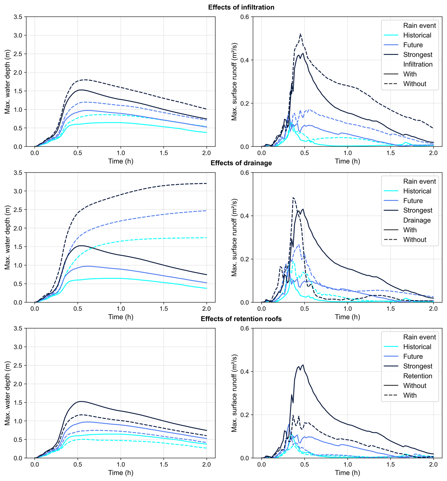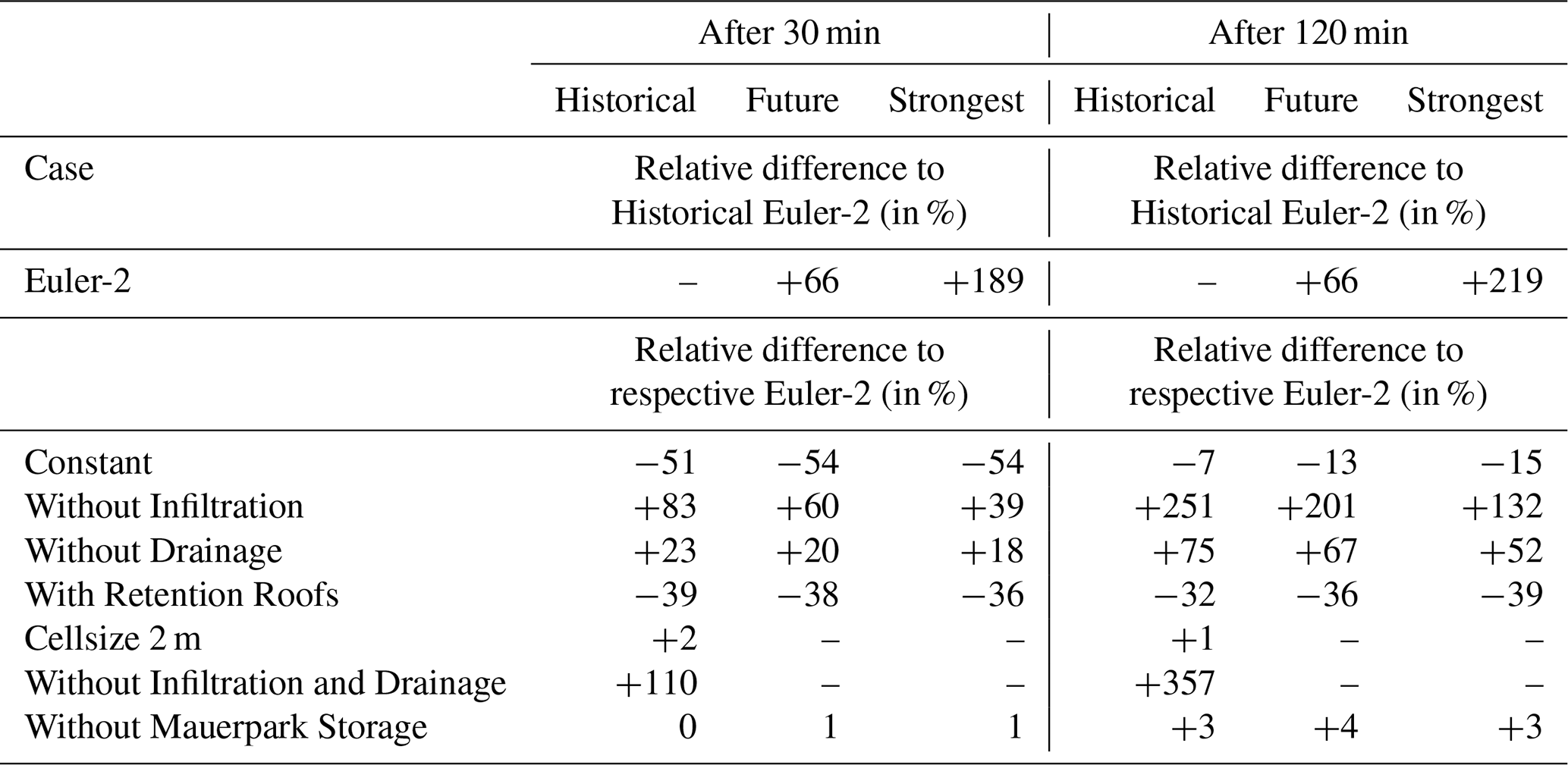 The combined effects of temporal rainfall distribution and infiltration, as well as time-dependent infiltration approaches, could be further explored but are beyond the scope of this study. The effect of the drainage system on the overall flood volume is reflected by changes of 23 % and 75 % (Historical 100a), 20 % and 67 % (Future 100a), and 18 % and 52 % (Strongest event) after 30 and 120 min, respectively. This indicates that the drainage system has a much stronger influence on the flood volume towards the end of the simulation than during the peak, with decreasing effectiveness with increasing rainfall sum. As shown in the previous section, the drainage system is particularly effective in reducing the highest water depths at local hotspots. Retention roofs reduce the flood volume by 39 % (Historical and Future 100a) and 37 % (Strongest event) after 30 min. After 120 min, the reductions are 32 % (Historical), 36 % (Future), and 39 % (Strongest). Since the consideration of retention roofs decreases the same percentage of the total rainfall volume in all scenarios, their effect on flood volume is very similar across events. For the Historical 100a event, the influence on flood volume after 30 min can be ranked as follows: (1) Infiltration (83 %), (2) Temporal rainfall distribution (51 %), (3) Retention roofs (39 %), and (4) Drainage (23 %). For the Strongest event, the ranking is: (1) Temporal rainfall distribution (54 %), (2) Infiltration (39 %), (3) Retention roofs (36 %), and (4) Drainage (18 %). After 120 min, the effectiveness of the drainage system is enhanced, reflected by increases of 75 % (Historical 100a) and 52 % (Strongest event) between simulations with and without drainage, moving it to rank 2. The effect of infiltration becomes more pronounced at the end of the simulation as more water can infiltrate over the longer time span. This leads to increases by 251 % for the Historical 100a and 132 % for the Strongest event between simulations with and without infiltration, ranking it 1 for both events. The temporal rainfall distribution has a smaller impact on the final flood volume, showing a 7 % reduction for the Historical 100a and a 15 % reduction for the Strongest event when comparing constant to Euler-2 rainfall, moving it to rank 4. The effect of retention roofs remains similar, maintaining rank 3. In conclusion, all three events show the same ranking of influencing factors on the flood volume after 120 min: (1) Infiltration, (2) Drainage, (3) Retention roofs, and (4) Temporal rainfall distribution.