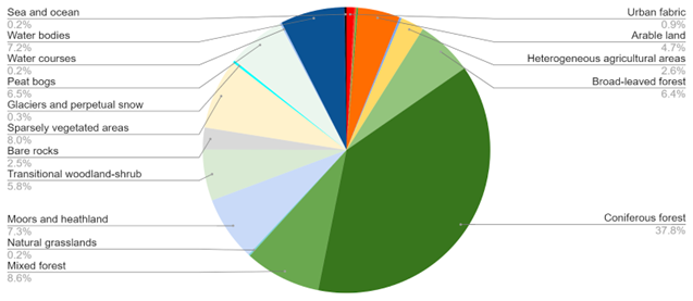 As seen in Fig. 2, coniferous forests cover the majority of Scandinavia, accounting for 37.8 % of the total surface area and mostly in Sweden and Finland where land cover is largely dominated by coniferous forests, as expected due to their economic reliance on the timber industry. Mixed forests and sparsely vegetated areas are the next most extensive land cover, accounting for 8.6 % and 8.0 % of the total surface area, respectively. In contrast to Sweden and Finland, Norway has a very high proportion of this sparsely vegetated area, and broad-leaved forests (6.4 % of Scandinavia) are also mainly found in Norway and along the Norwegian-Swedish border. Arable land and heterogeneous agricultural areas account for respectively 4.7 % and 2.6 % of total land cover. Urban fabric only accounts for 0.9 % of the total surface area in the region whilst the vast majority of arable land is located in Southern Sweden and Finland.