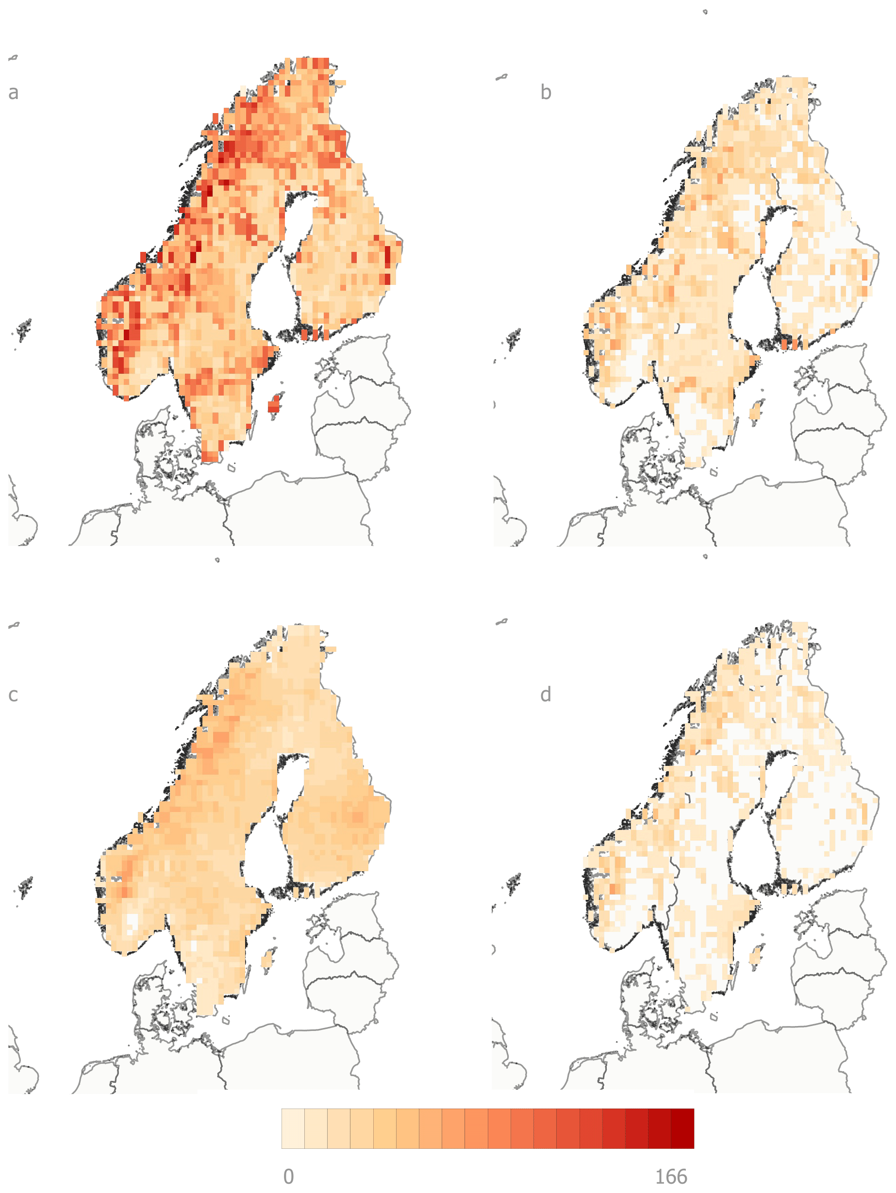 This study has potential limitations for risk mapping, evaluating impacts, among others. The multi-hazard risk maps were put together using atmospheric data originally used for a heatwave, drought and wildfire risk analysis of continental Europe, which resulted in coarser resolution when cropping to the Scandinavian region. The aim of this study was not to generate new data but to use this previous research to produce multi-hazard risk maps of the selected regions. Due to the scope of this study, the land cover datasets were retrieved from Copernicus' Land Monitoring Service instead of national land cover datasets. This helped keep the land cover analysis consistent for all three countries included in the study, but also rendered a coarse land cover map of Scandinavia.