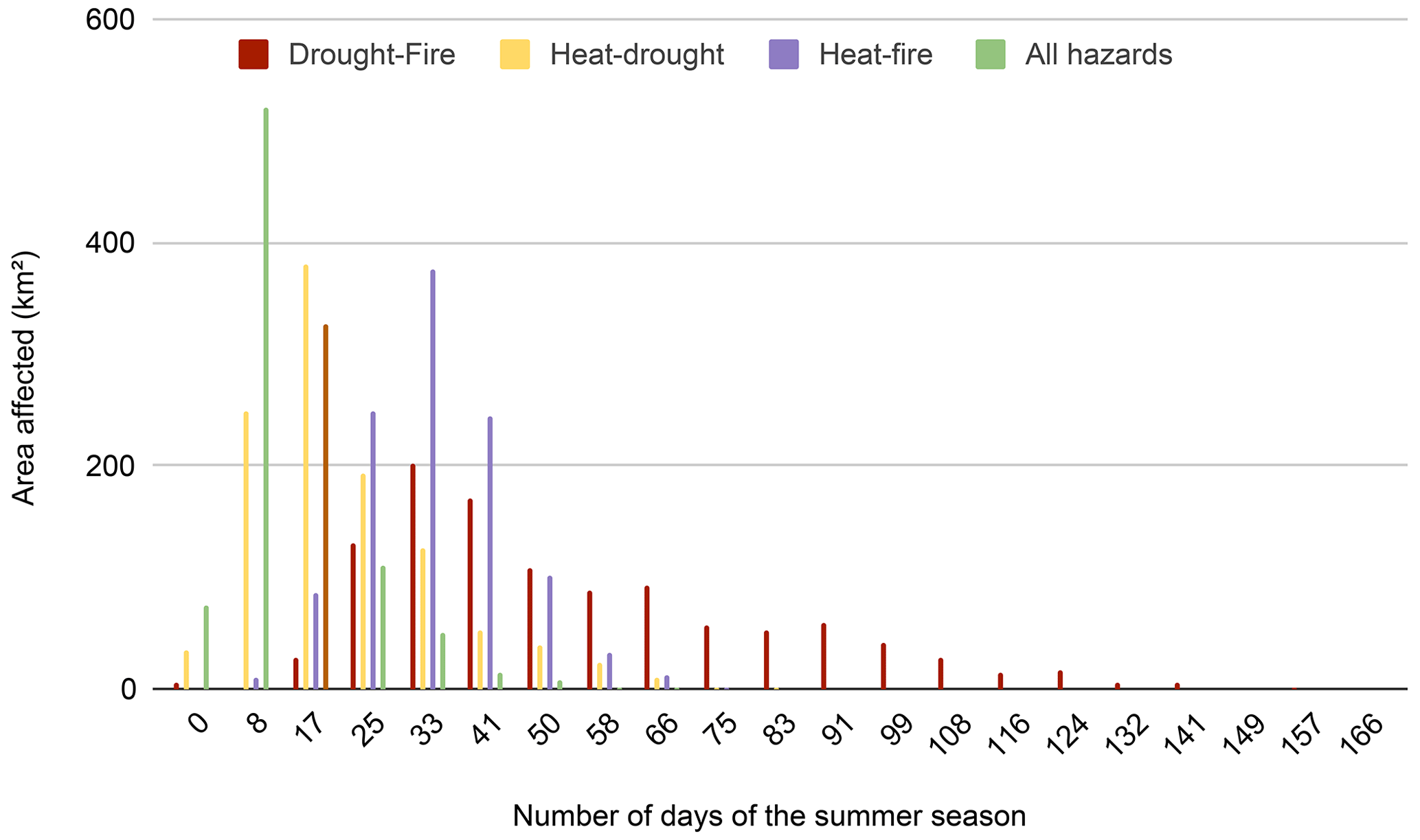 Figure 4Amount of land (in km2) affected by the compound hazard combinations, in number of days, over the period 2000–2018.