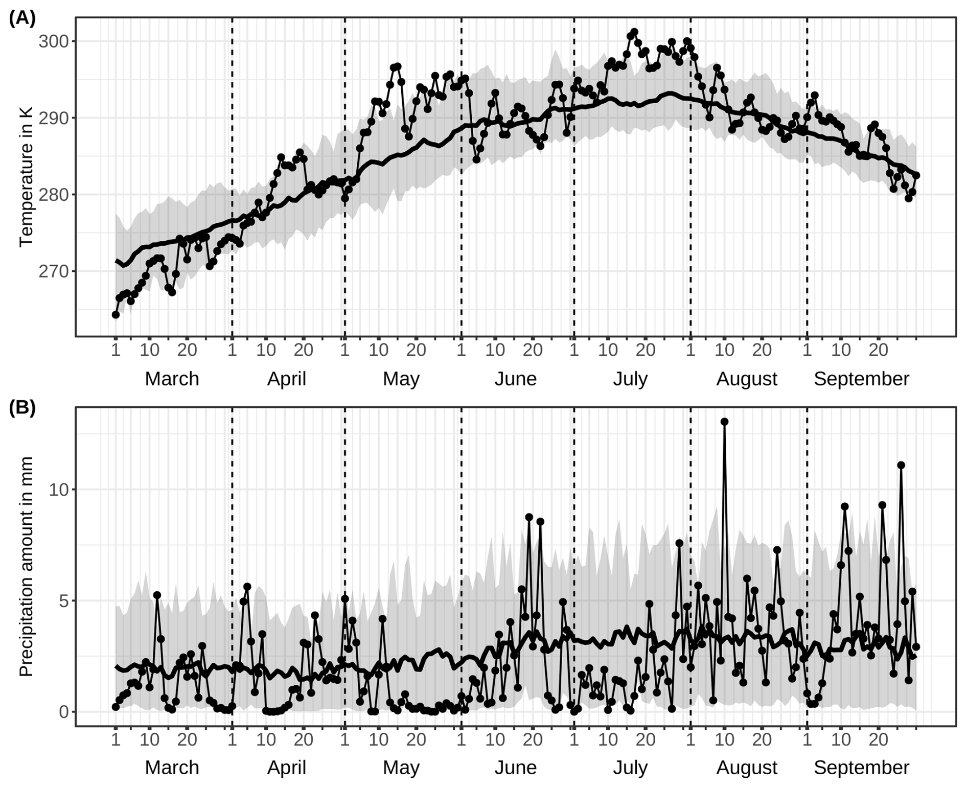 Figure 7ERA5 daily maximum (A) temperature and (B) total precipitation averaged over Norway, Sweden and Finland. 2018 values are denoted by connected dots, while the thick solid line and the gray shaded area are the mean and central 90 % interval over the years 1979–2023.
