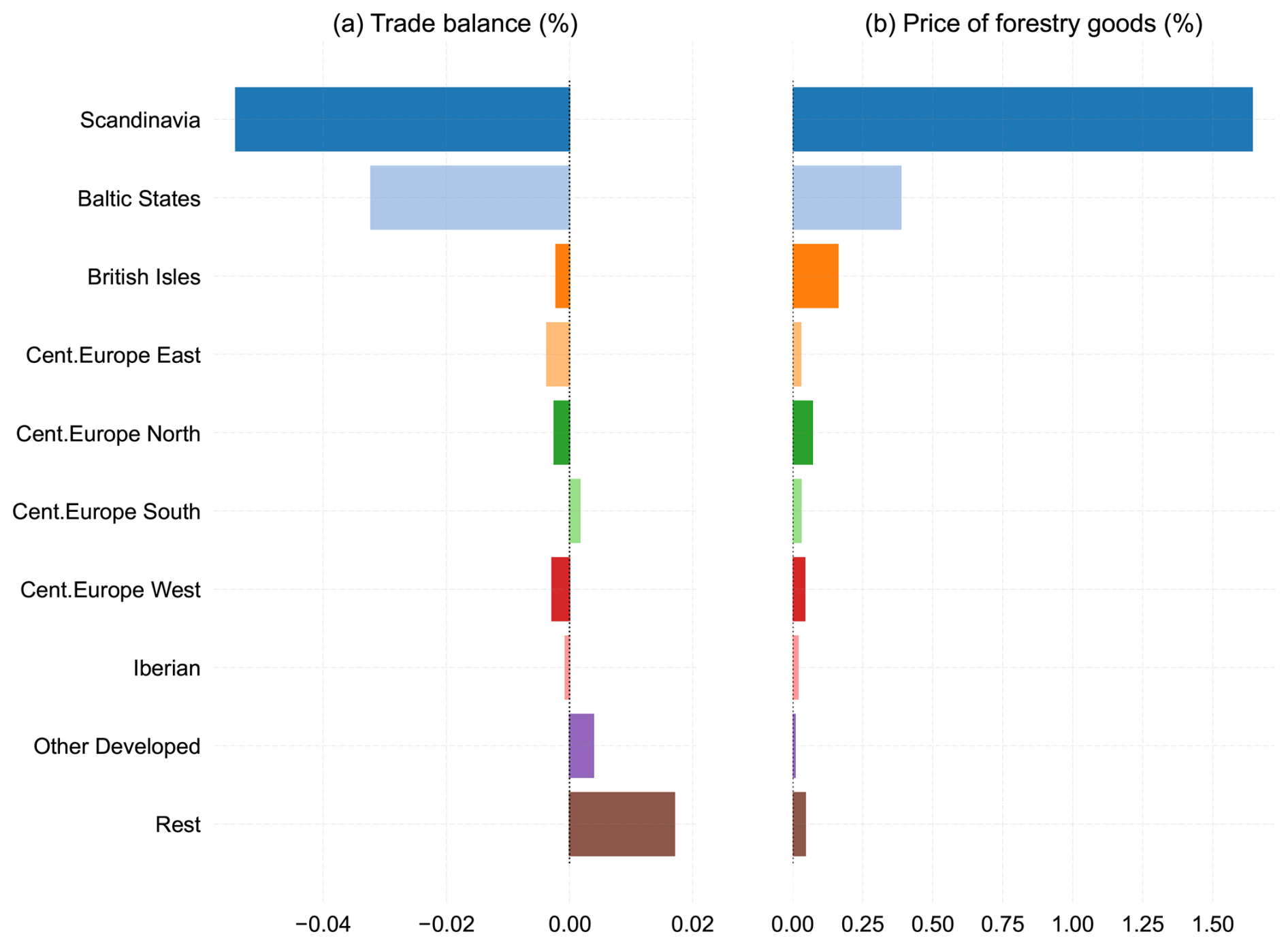 Despite having a strong forestry sector, the Baltic region is projected to see a 0.03 % decrease in its trade balance. This decline is largely due to the dominant position of Scandinavian forestry products in the global market. The reduced supply of forestry goods from Scandinavia could not fulfill the global demand and increased prices of wood products worldwide. As illustrated in Fig. 10b, wood products from the Baltic states have experienced a 0.39 % price increase, the second highest price increase after the Scandinavian region. The large surge in prices created a comparative disadvantage for Baltic forestry products in the global trade market, making them less competitive compared to alternatives. Consequently, this explains the negative ripple effect on the trade balance volume in the Baltic states.