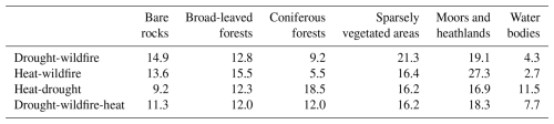 In order to produce the main land cover types affected by the studied compound hazard combinations, the multi-hazard maps of Scandinavia from Sect. 2.2.2 were overlaid with the land cover map of Scandinavia generated in Sect. 2.2.3, using the multi-hazard maps as references for resolution. Subsequently, we derived the amount of land affected by each hazard combination per land cover type with spatial analysis.