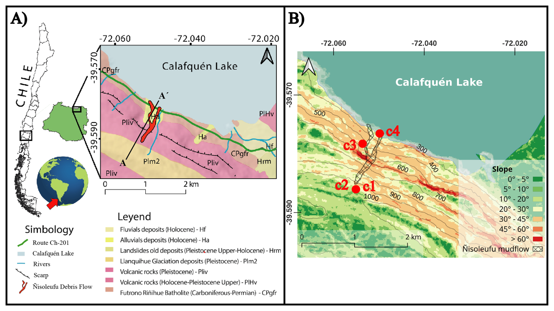 The Ñisoleufu area exhibits a geological sequence (Fig. 2A) starting at the base with the Futrono-Riñihue Batholith (CPgfr), followed by stratified volcano-sedimentary units (Pliv) and topped by glacial deposits (Plm2). Within this sequence, the Sierra Quinchilca volcano-sedimentary unit has been dated to less than 1 million years and is in nonconformity contact with the underlying rocks of the Futrono-Riñihue Batholith. Consolidated glacial deposits from the last glacial maximum period show variable depths, ranging from 1 m to 10 cm, and lie in erosive unconformity over the volcano-sedimentary units (Pliv). The area also exhibits mass movement deposits (Hrm and Ha) covering the older units on the north slope of Sierra Quinchilca (Pliv, Fig. 2A; Rodriguez et al., 1999).