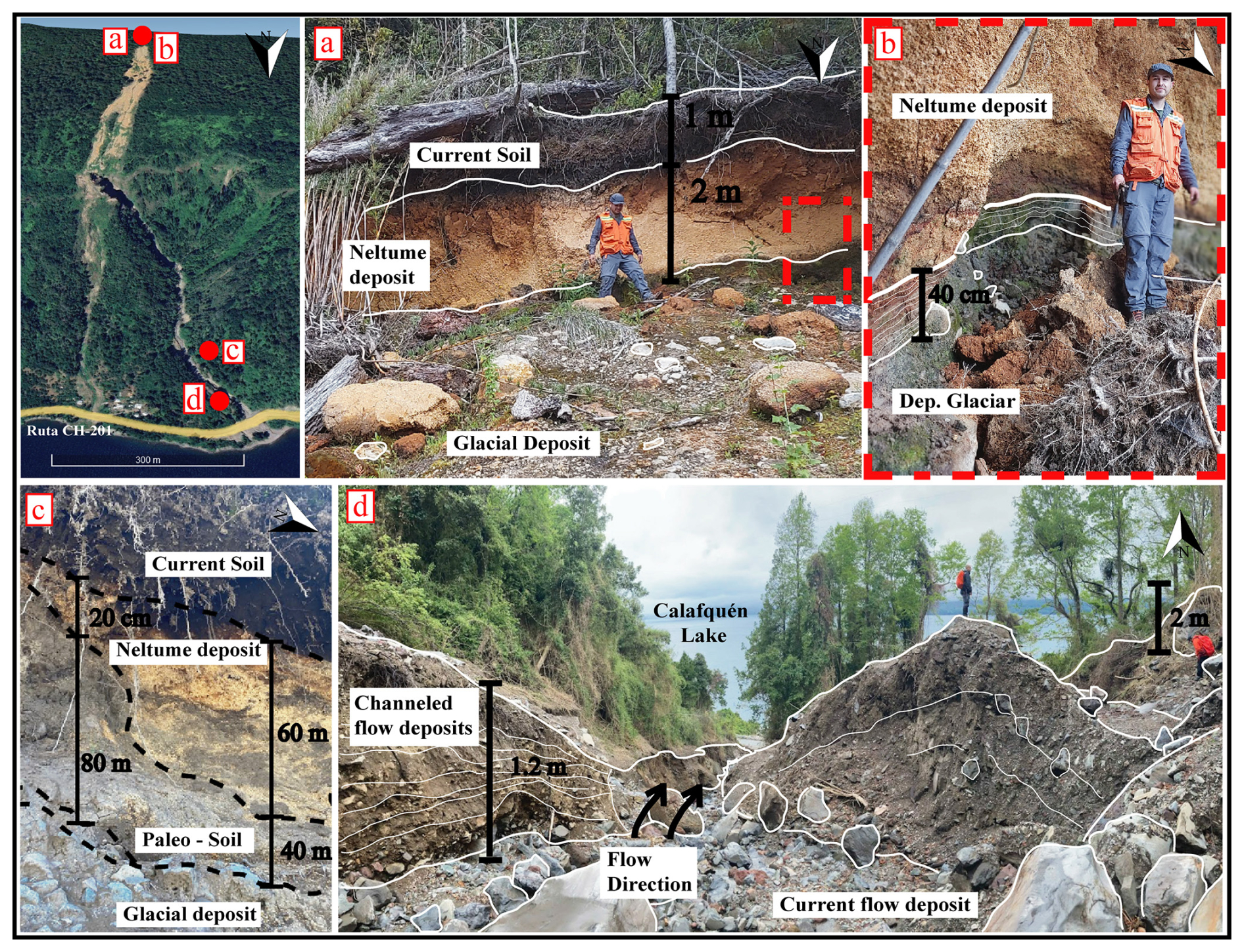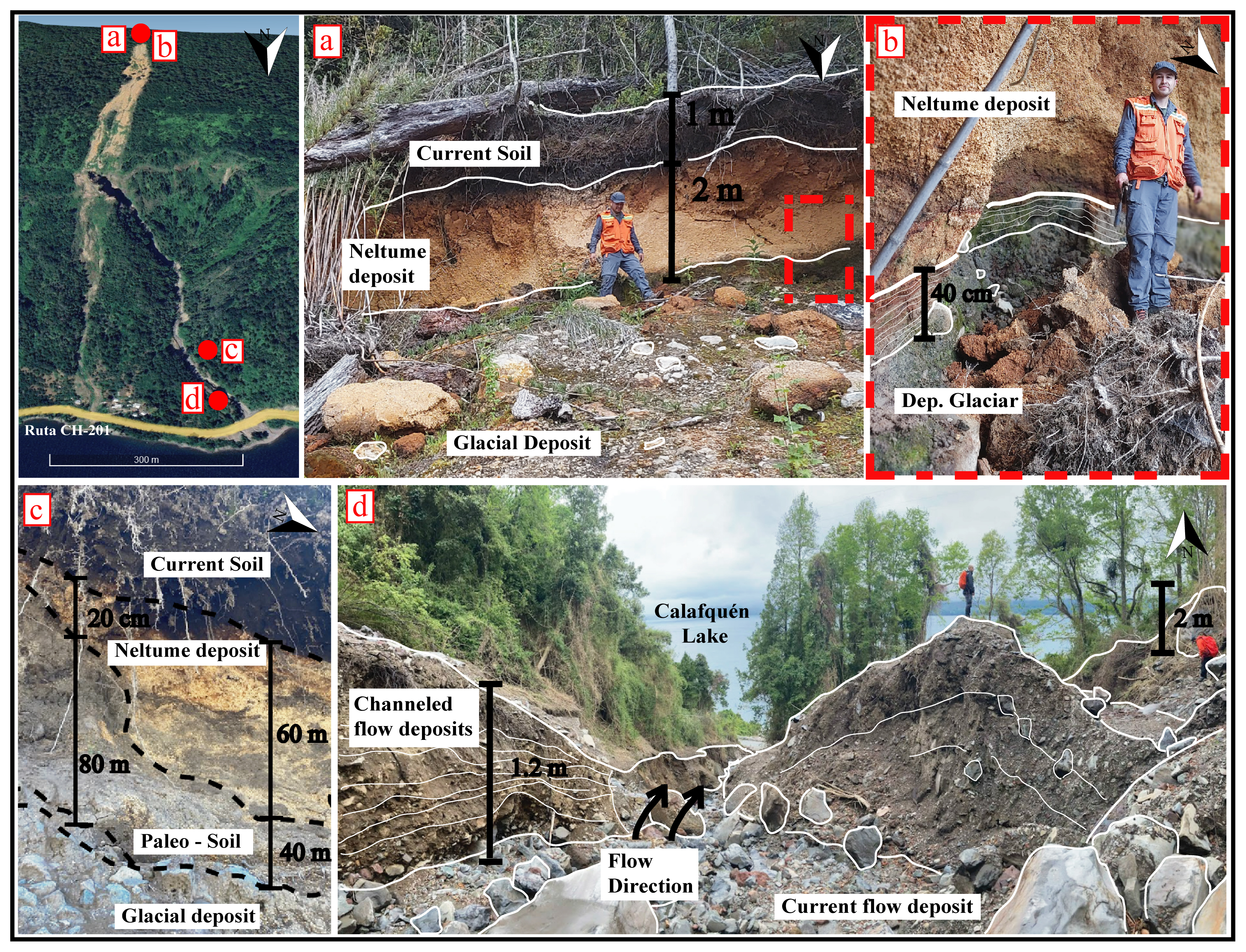 The Southern Volcanic Zone (37.5–41.5° S; Stern 2004) has been shaped by significant volcanic Holocene eruptions (Fontaine et al., 2021; Moreno-Yaeger et al., 2024; Singer et al., 2024), leading to the formation of soils primarily composed of lapilli and/or ashes that settled following the contours of the topography, resulting in layers with varying thicknesses (Stern, 2007). Old deposits in the zone show similarities to the current debris flow deposits (Figs. 5B; 10a), suggesting that the event triggered in 2021 is not an isolated occurrence in the area. This evidence points to a history of recurring debris flow events in the region. This condition is dominant in all the surroundings of the Mocho-Choshuenco volcanic complex (Rawson et al., 2015; Moreno-Yaeger et al., 2024).