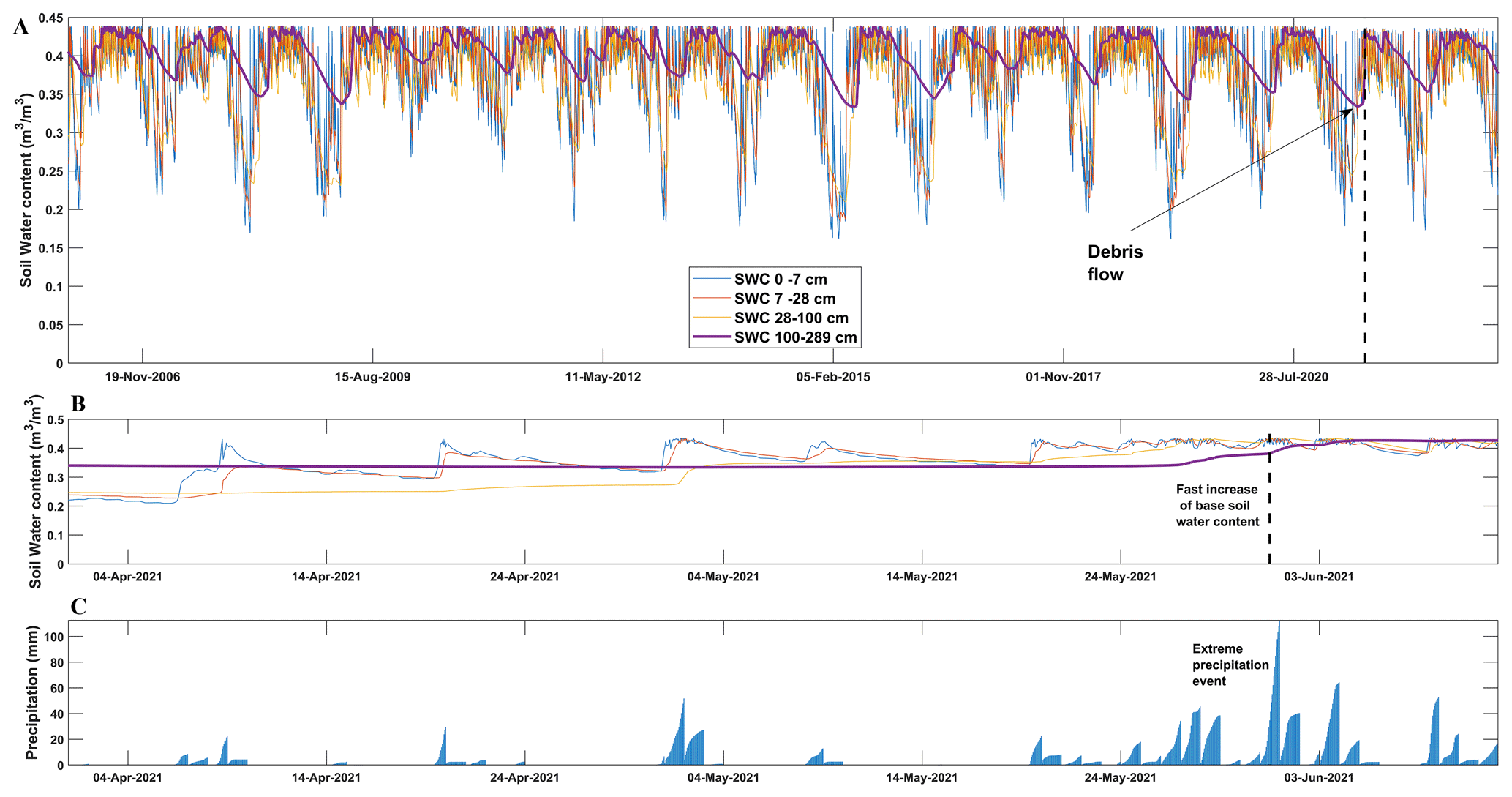 Figure 8Assessment of ERA5-land product over debris flow generation. (A) Assessment of time series of soil moisture at different depths. (B) Zoom to Soil moisture weeks previous to debris flow. (C) Rainfall events accumulated at 24-hourly scale (ERA5-land).