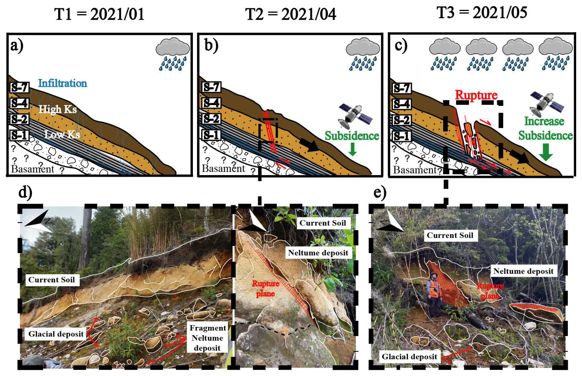 Our results show that precursory signals such as small progressive deformation of the surface (Fig. 10) could suggest the indication of possible soil slides previous to initiation of the debris flow (Fig. 10). This phenomenon is influenced by fine soil interspersed with glacial deposits, superimposed on moraines and volcanic deposits, common throughout the southern Andean region (Moreno-Yaeger et al., 2024; Singer et al., 2024). A simple geomorphological generalization highlights the necessity of investigating the interaction between glacial and volcanic deposits to understand better the interplay between media with constraints on soil hydraulic conductivity. Future studies should prioritise examining these dynamics to prevent and mitigate potential risks associated with similar landslide events across the broad area of the Southern Andes.