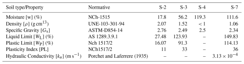 From a geotechnical perspective, the first soil (S-2) has a liquid limit of 27.48 and a plastic limit of 16.07, resulting in a plasticity index of 11. This soil exhibits a low plasticity and is classified as a silt (CL) according to the Unified Soil Classification System (USCS). S-3 showed a liquid limit of 123.93 and a plastic limit of 91.3, resulting in a plasticity index of 33. This soil exhibits a moderate plasticity and is classified as a plastic silt (CH), according to the USCS. Meanwhile, S-7 has a liquid limit of 149.83 and a plastic limit of 114.13, resulting in a plasticity index of 36, showing a high plasticity and is classified as a plastic organic soil (OH). The granulometric analysis (Fig. 6; S-3 and S-7) confirms this classification, with silt and sand content between 70 % and 90 %. Due to the soil properties, S-4 (Neltume ashfall pyroclastic) has not been characterised in the laboratory due to the high fragility of the pyroclasts classified as lapilli (> 5 mm) being too coarse to measure their limits.