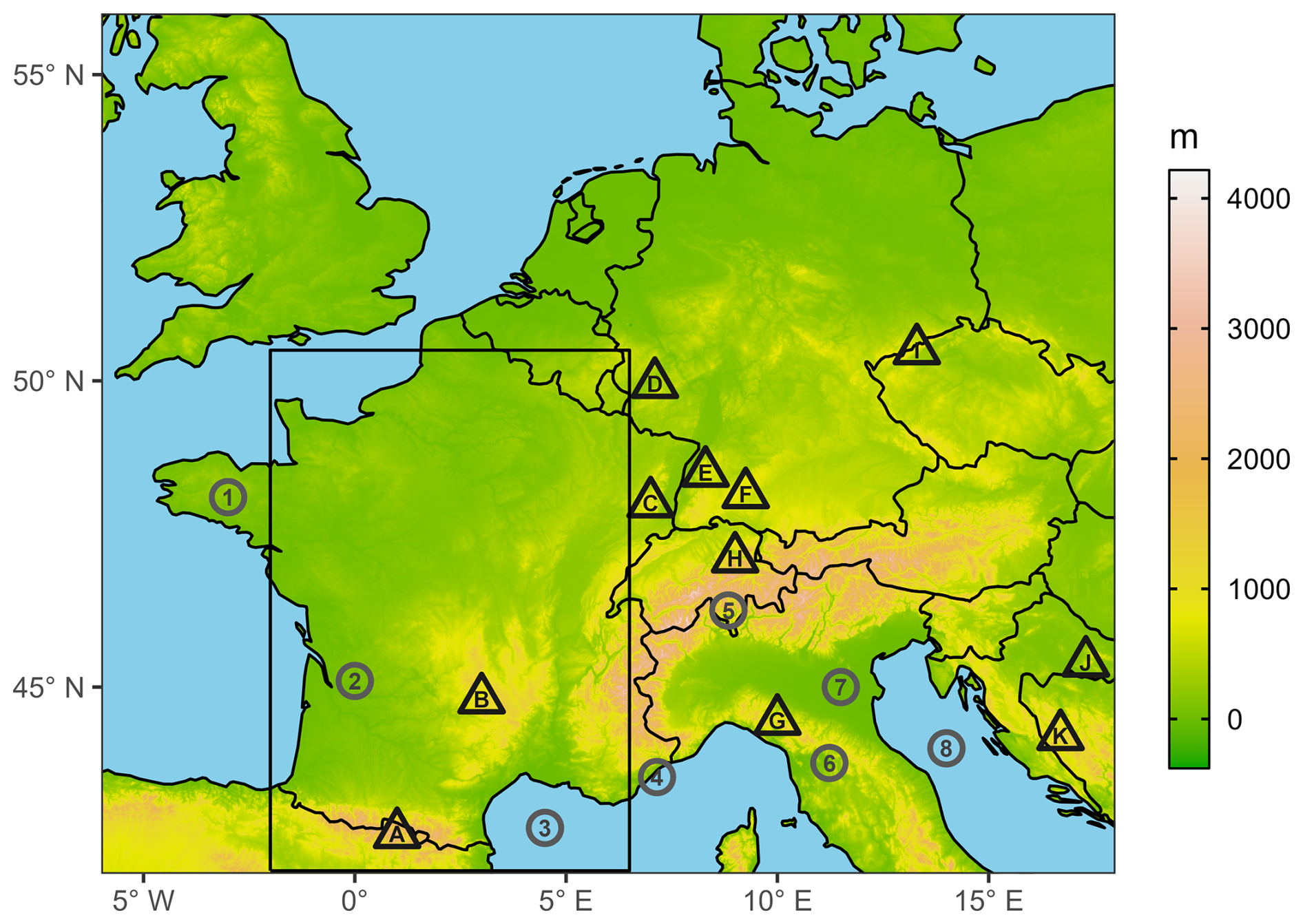 Figure 1The topography of the investigation area is shown, as are the geographical regions (numbers in circles) and mountainous regions (capital latin letters in triangles) that are referenced in this study: 1 Brittany, 2 Gironde estuary, 3 Western Mediterranean Sea, 4 Nice, 5 Ticino, 6 Florence, 7 Po Valley, 8 Adriatic Sea; A Pyrenees, B Massif Central, C Vosges, D Eifel, E Black Forest, F Swabian Jura, G Appenines, H Säntis, I Ore Mountains, J Pozegan Mountains (Psunj), K Dinaric Alps. The black box indicates the sub-study area mentioned in Sect. 6.