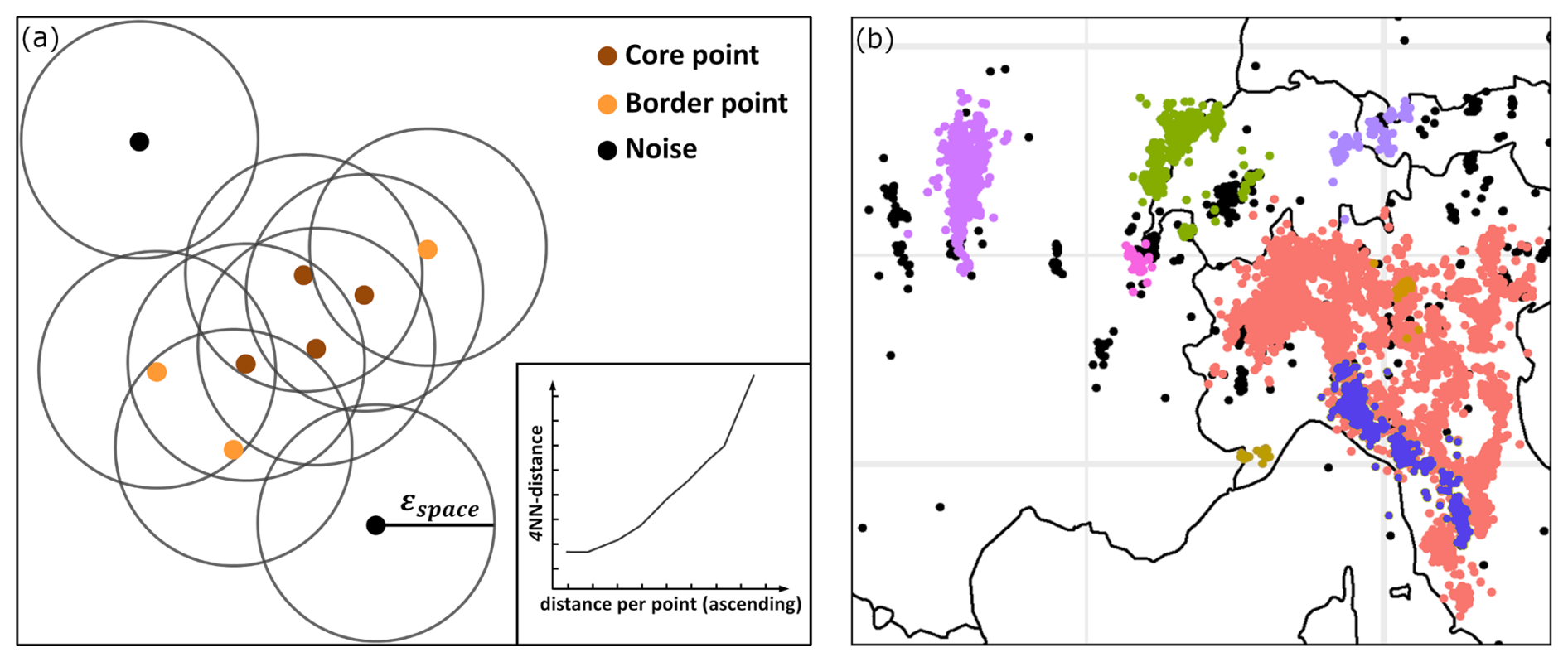 Figure 2(a) Schematic illustration of how the DBSCAN algorithm distinguishes points from a point sample into core points (brown), border points (orange), and noise (black) based on predefined density criteria (here exemplarily minPts =4; black circles indicate εspace). The kNN-distance (here exemplarily k=4, see definition in text) of each point sorted in ascending order is shown in the bottom right. (b) Example of clusters (different colors) and noise (black) derived with ST-DBSCAN from EUCLID lightning data on 9 May 2001 (minPts =40,εspace=50km2, εtime = 20 min). Note also the temporal differentiation of clusters in Italy (right, red and blue clusters). See Sect. 3 for the definition of the density parameters used in the study.