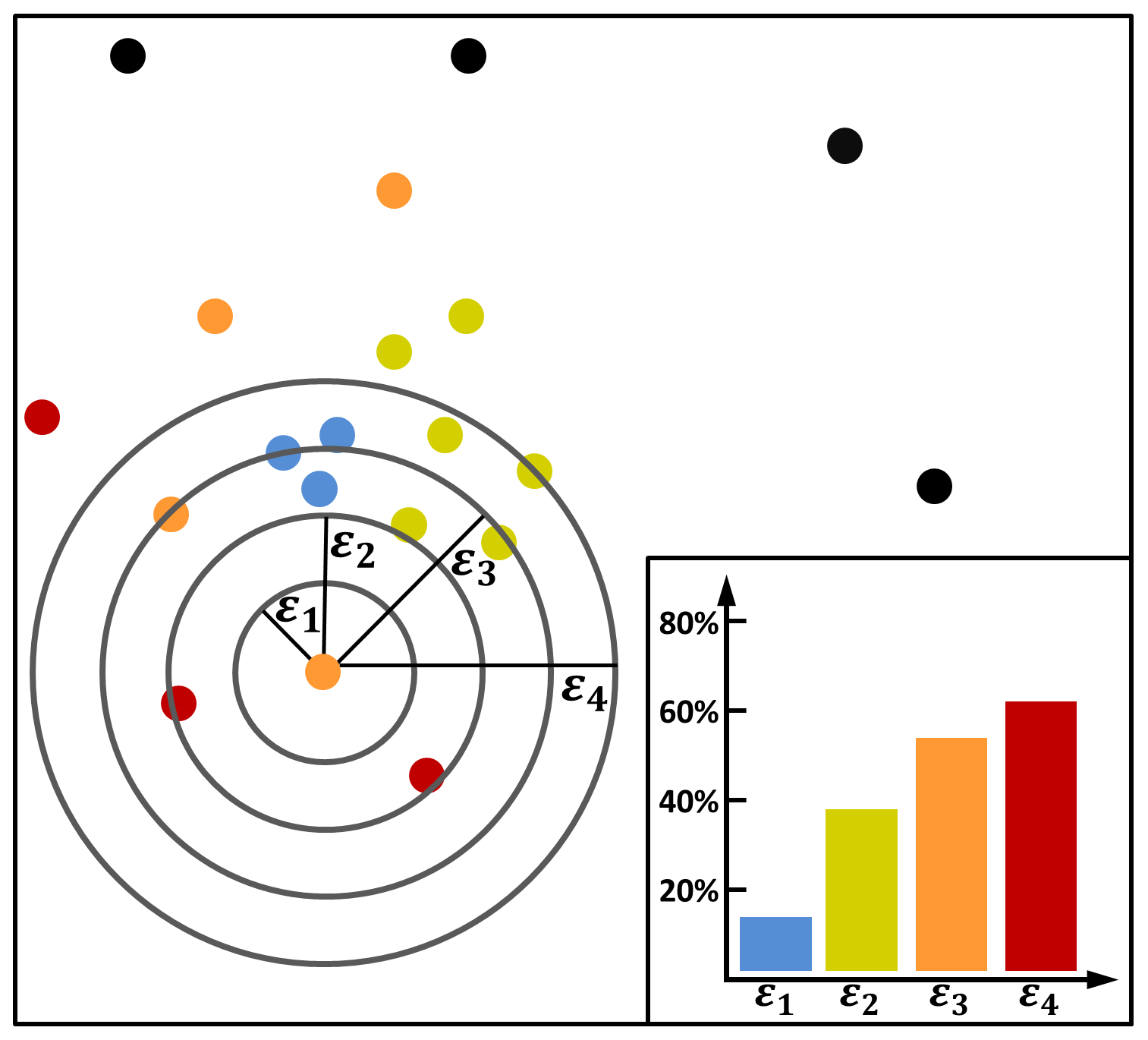Figure 3Exemplary sketch for determining “optimal” εspace values for the ST-DBSCAN algorithm using the 2D modified kNN distance approach (detailed definition in text). Point sample (here exemplarily 20 points) and different ε1 to ε4 around a starting point (black circles). Different colors indicate points categorized as dense with different density definitions: minPts = 4 and εx (ε1 red, ε2 orange, ε3 light green, ε4 light blue). Black points indicate noise (not matching the density criteria regardless of εx). The bottom right corner shows the percentage of points that meet the density criteria as a function of εx.