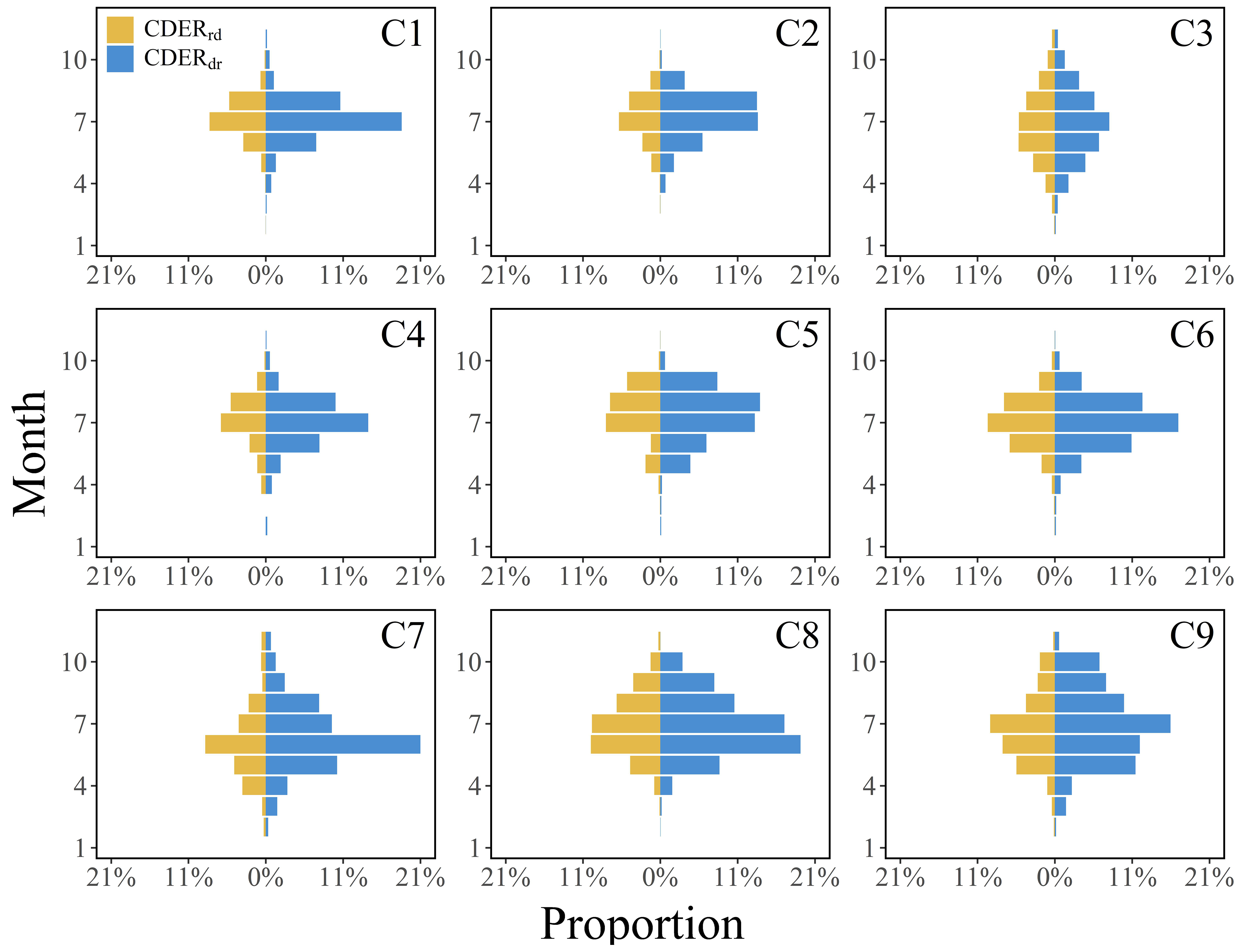 There are distinct seasonal differences between CDERdr and CDERrd. This study statistically analyzes the monthly average proportions of affected areas for CDERrd and CDERdr (Fig. 4). Among the nine major agricultural regions, the temporal variation trends in affected area proportions across different regions are similar, with no significant inter-regional differences. The bar charts for each region exhibit unimodal distributions: northern regions (C1∼C6) reach peak coverage in July, while southwestern and southern regions (C7∼C8) peak in June when CDERdr achieve maximum coverage. Overall, CDERdr show the highest disaster coverage during summer months (June, July, August), significantly exceeding other seasons, followed by spring and autumn. Across all agricultural regions, the affected area proportions of CDERdr from December to February are nearly zero, indicating extremely low winter occurrence frequencies, with limited distributions only in the Middle-Lower Yangtze River region, southwestern region, and southern region.
