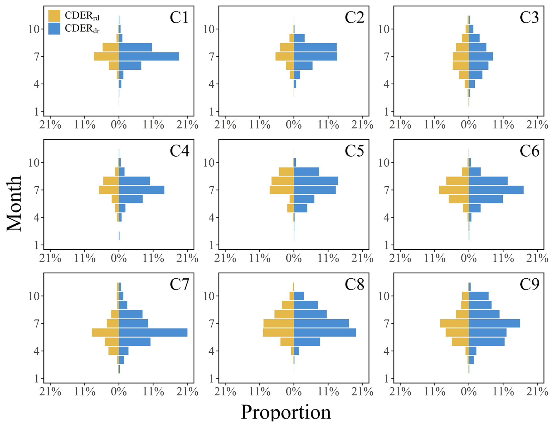 Simultaneously, comparing monthly affected area proportions between CDERdr and CDERrd reveals consistent inter-monthly variation trends: similar spatial distributions concentrated in summer, secondary peaks in spring/autumn, and minimal winter occurrences. However, the affected area proportions of CDERdr are significantly higher than those of CDERrd, nearly doubling the latter. For instance, in region C1, the July coverage proportion of CDERdr reaches 20 %, whereas CDERrd peak at only ∼10 %. Overall, CDERdr coverage proportions are approximately twice those of CDERrd. Notably, in region C5, the August affected area proportion of CDERdr exceeds that in September, whereas CDERrd show the opposite pattern.