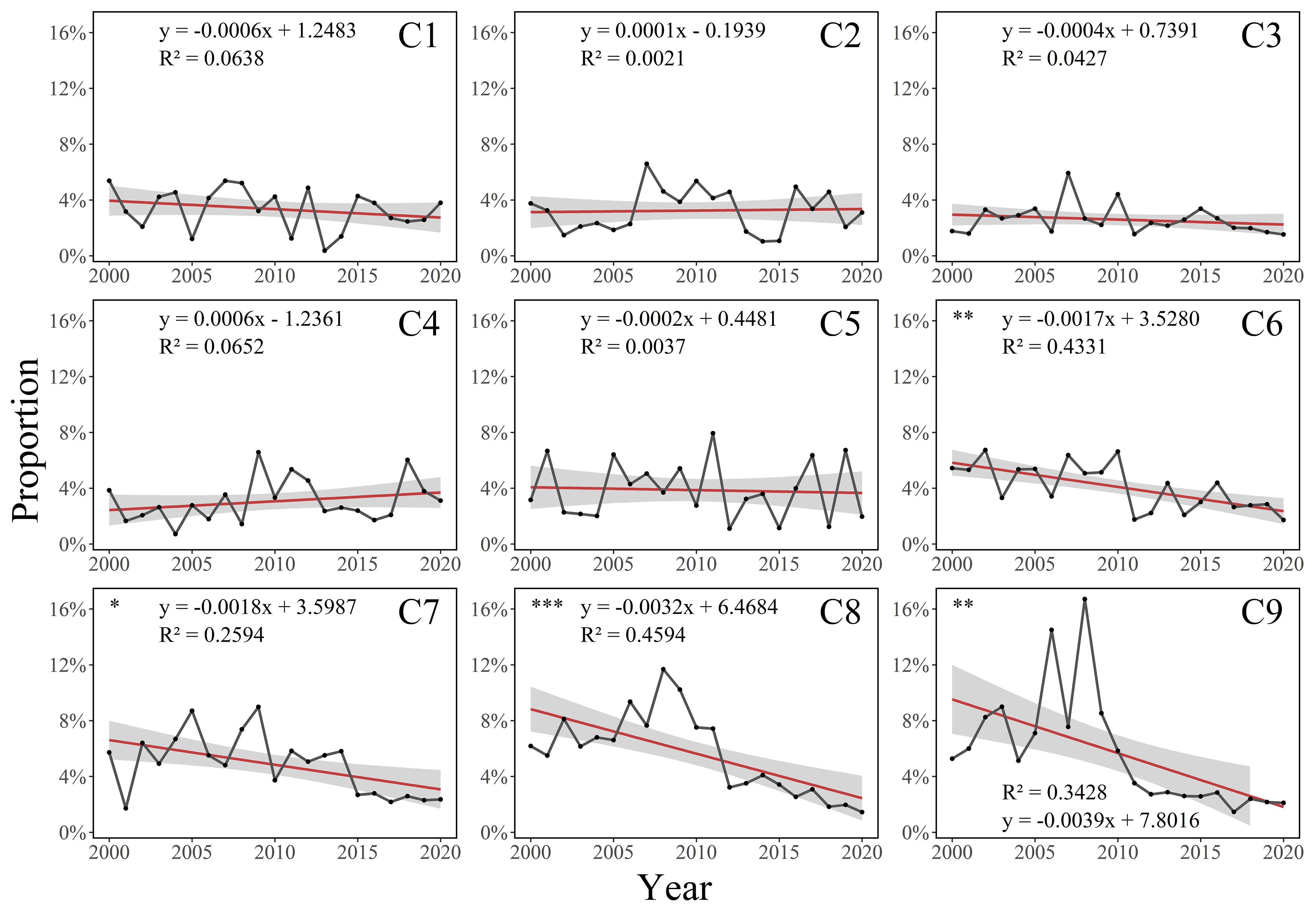 The interannual variation trends in affected areas of the two compound event types exhibit regional differences. This study further analyzes the changing trends in affected area proportions of CDERdr and CDERrd across agricultural regions from 2000 to 2020 (Figs. 5 and 6). The nine agricultural regions show similar distribution patterns, with most regions maintaining relatively stable interannual variation trends and insignificant changes. Regional heterogeneity primarily manifests in C1, C3, and C6–C9, where both compound types exhibit declining trends (p<0), with CDERdr showing more pronounced frequency reductions. Specifically, C1 and C3 demonstrate insignificant downward trends characterized by relatively stable event frequencies with minor fluctuations. In C3, annual mean frequencies of CDERdr and CDERrd generally exhibit synchronized fluctuations, whereas no significant correlation is observed between them in C1. The declining trends in C6–C9 are notably stronger, collectively showing higher frequencies before 2010 followed by significant post-2010 reductions, despite occasional minor rebounds.