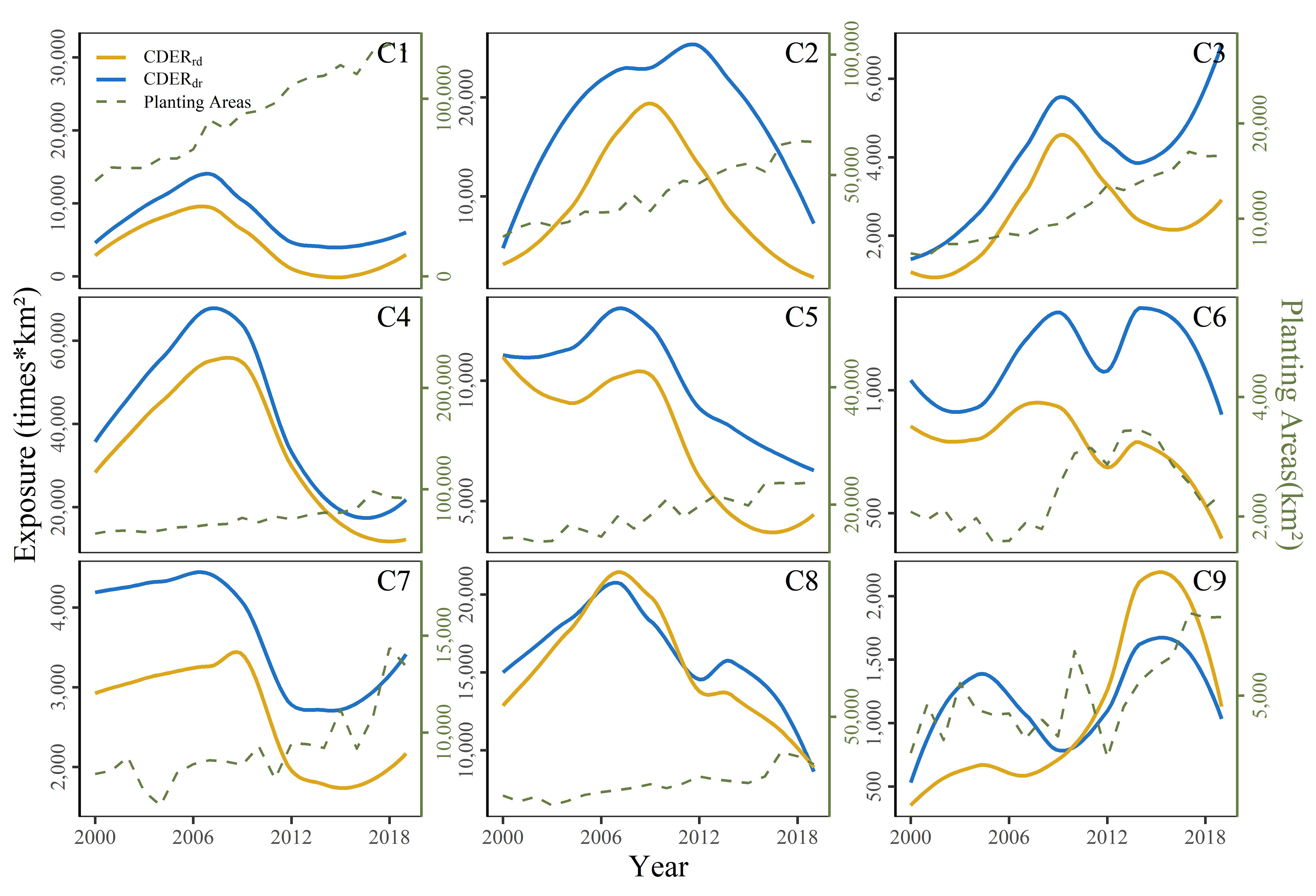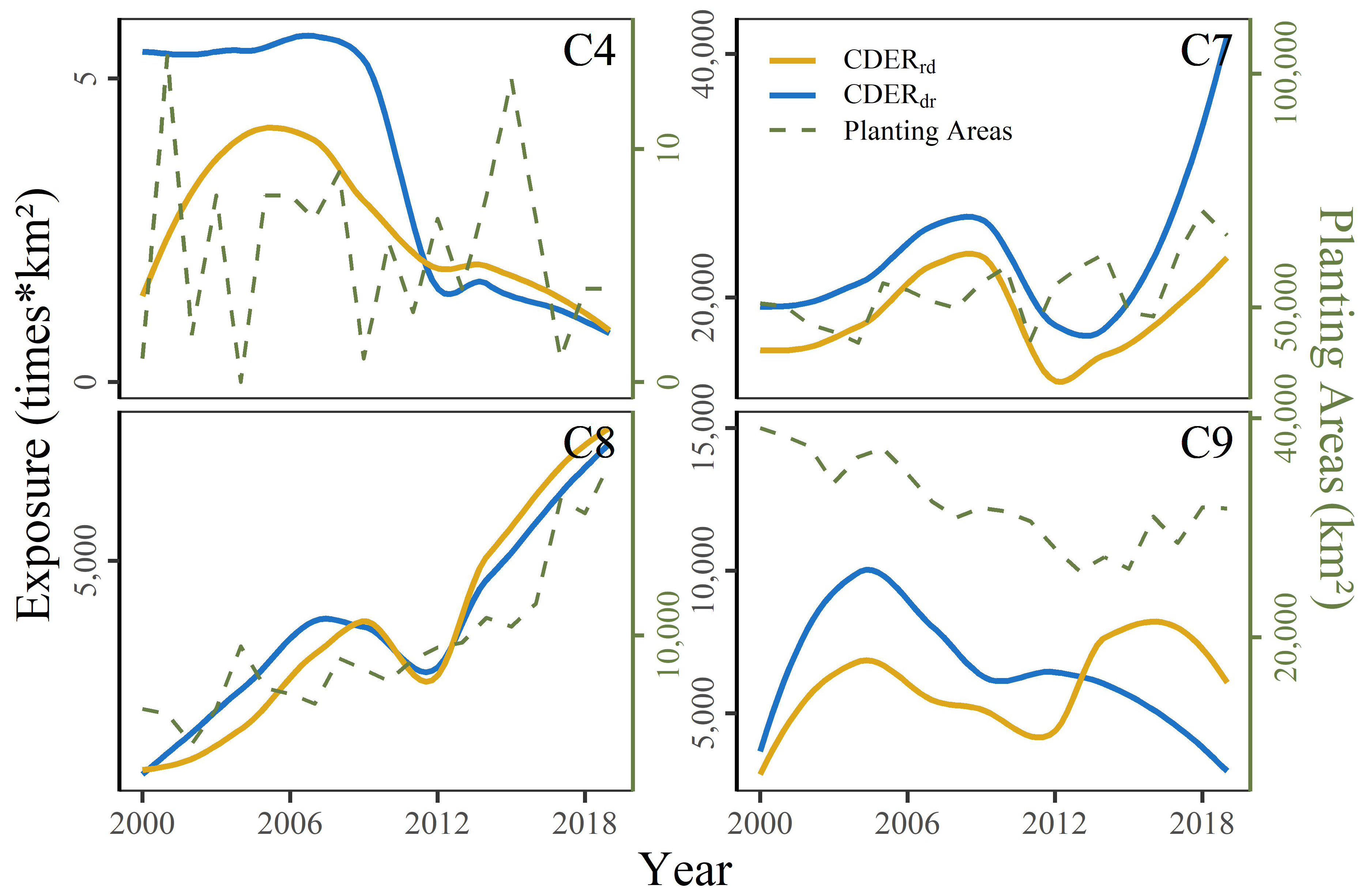 Based on rice exposure data from 2000–2019 across China's nine major agricultural regions, fitting curves were constructed (Fig. 9). Regions C1 (Northeast), C2 (Inner Mongolia-Great Wall), C3 (Gansu-Xinjiang), C5 (Loess Plateau), and C6 (Qinghai-Tibet Plateau) exhibit zero exposure throughout the period due to negligible rice cultivation and are excluded from presentation. Regionally, C7 shows the highest exposure (up to 40 000), followed by C8 and C9, with C4 displaying the lowest. Comparatively, exposure between CDERdr and CDERrd is generally similar, though CDERrd risks were lower than CDERdr prior to 2013 but higher post-2013. However, in C7, CDERrd exposure remains consistently lower than CDERdr. Trend analysis reveals divergent evolutionary patterns: C4 demonstrates an initial rise followed by decline and subsequent increase, peaking around 2006 before declining sharply. C7 and C8 both exhibit rise-fall-rise trajectories, peaking around 2010, troughing near 2012, then rebounding. Southern China (C9) displays distinct behaviors: CDERdr exposure follows a rise-decline pattern, while CDERrd exposure shows rise-decline-rise-decline fluctuations. Meanwhile, it is noteworthy that the exposure of C7, C8, and C9 changes in lockstep with the rice-planted area. In particular, although the rice-planted area in C4 has increased, its exposure has shown a consistently declining trend, revealing distinct differences among the trajectories. These findings indicate that rice exposure is strongly influenced by intrinsic factors such as event frequency, yet the planted area also exerts a substantial effect. This may be attributable to the relatively stable frequency and intensity of events in rice-growing regions, which accentuates the impact of changes in planted area.